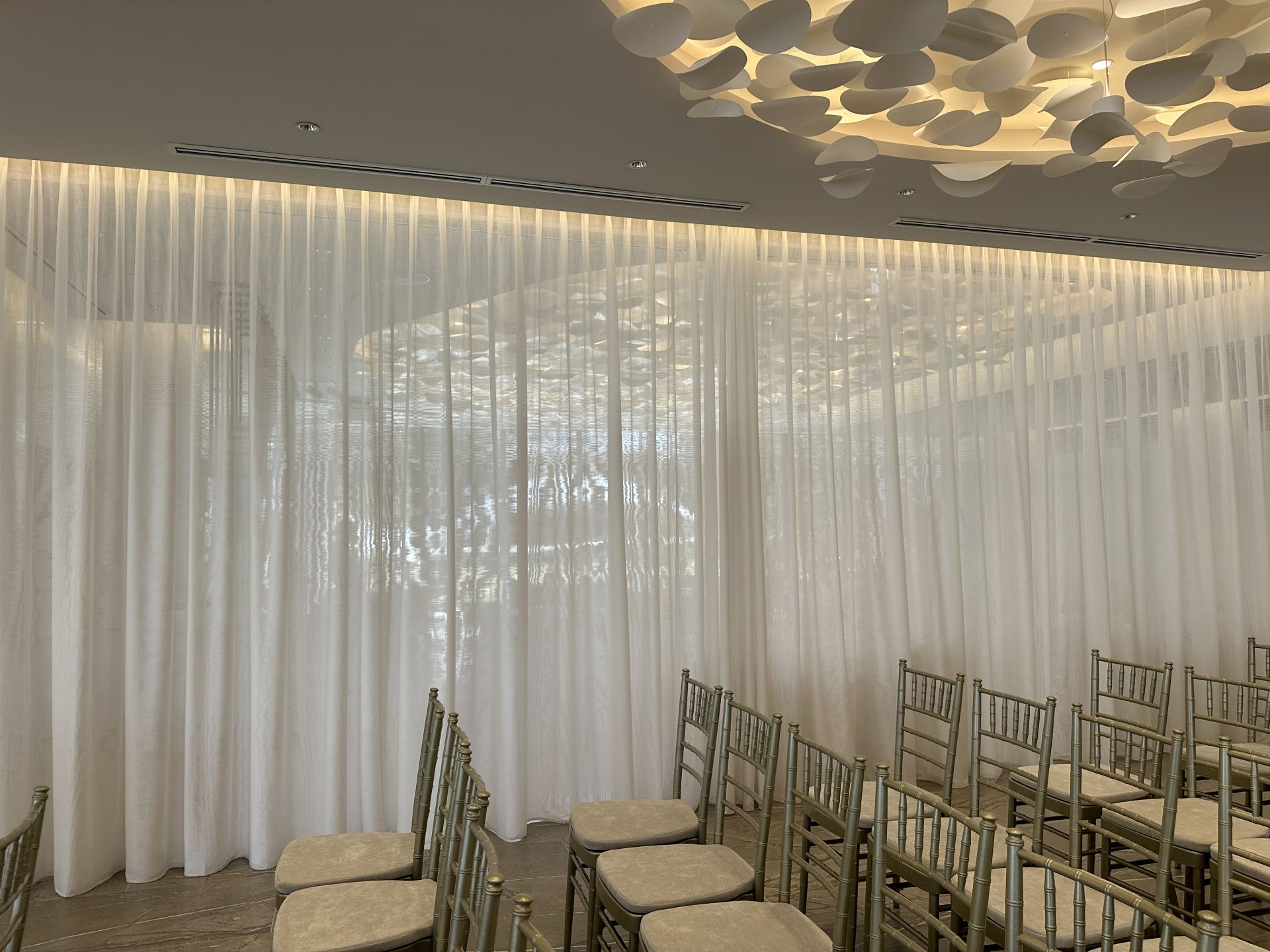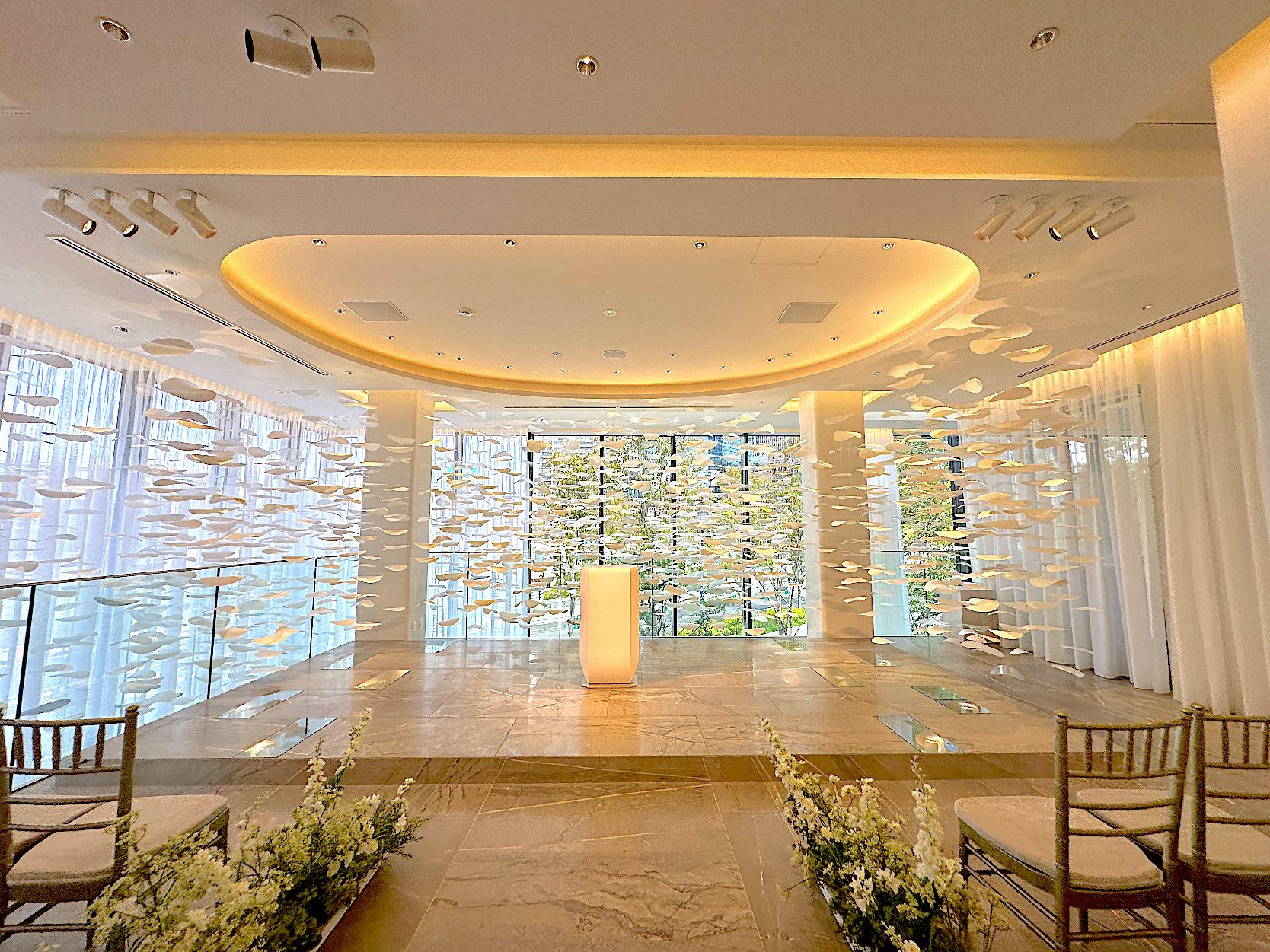 アフタヌーンティー会場横のウェディング会場です。シャンパンの泡をイメージした煌びやかな空間が、白とゴールド、大理石でゴージャスに演出されています。カーテンは上部が薄く、下部が厚いグラデーションになっており、外からの視線を気にせず、自然光を取り入れることができます。カーテンを閉めても開放感があり、外の喧騒を忘れさせる静かで厳かな空間です。