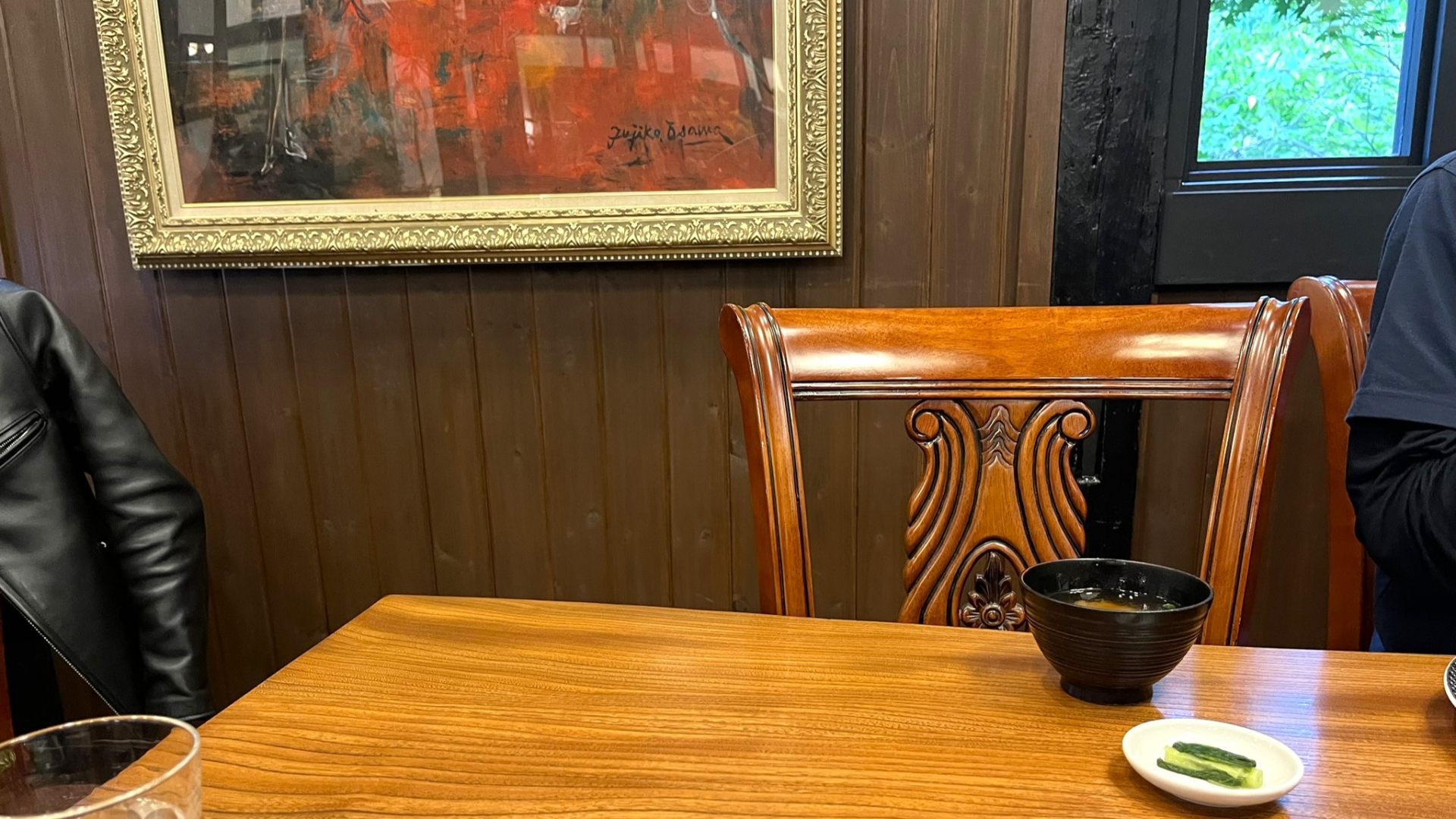 築約400年の古民家で、和モダンの店内でテーブル椅子は重厚感があり、ゆったりとお食事ができます。お客様がたくさんいて内装は撮れなかったので、テーブル付近を少しだけ。