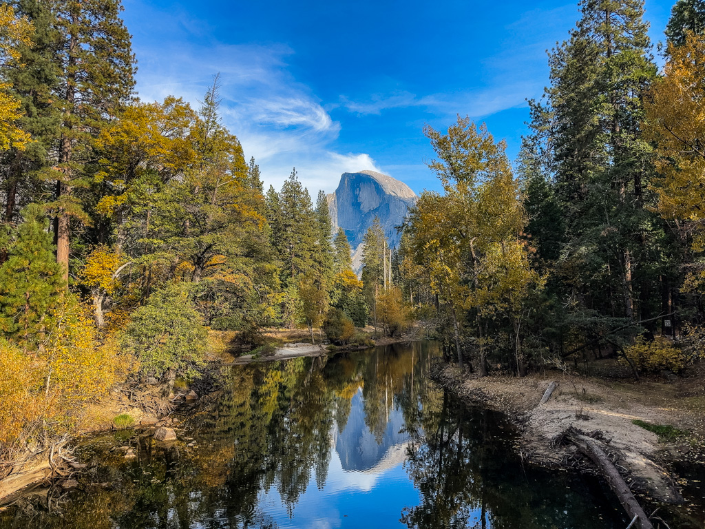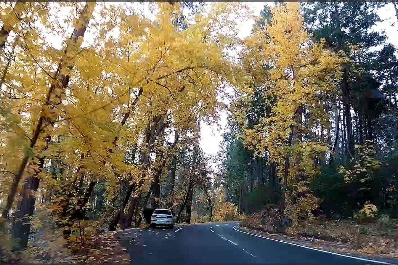 11月に入って、標高1200mのヨセミテ渓谷も紅葉が今が盛りです。訪問した9日通行止めが解除されていましたが、13日は、初冬の嵐の来襲で2300mのGlacier Point Rdは今年3回目の通行止めになっています。短い紅葉の時期を楽しんでください。1週間後に訪問した時は、標高1900mのCrane Flat近くのTuolumne Groveはすっかり雪の下でした。