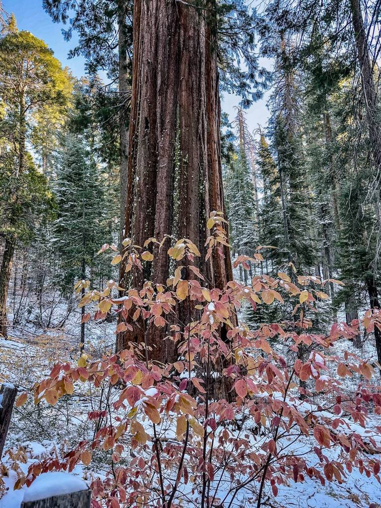 1週間後の11/16日に訪問した時は、朝はBOF入口からの道がR2チエーン規制だったのですが、お昼には解除されたので、BOF道路を登ってTuolumne Groveを訪問してきました。1200mのヨセミテ渓谷は相変わらず紅葉の真っ盛りでしたが、700m登ったTuolumne groveはすっかり雪のおおわれていました。このシーズン初の雪の上を歩く往復4Km, 90分のハイキングを楽しんできました。靴に被せる簡易アイゼンが大活躍です。