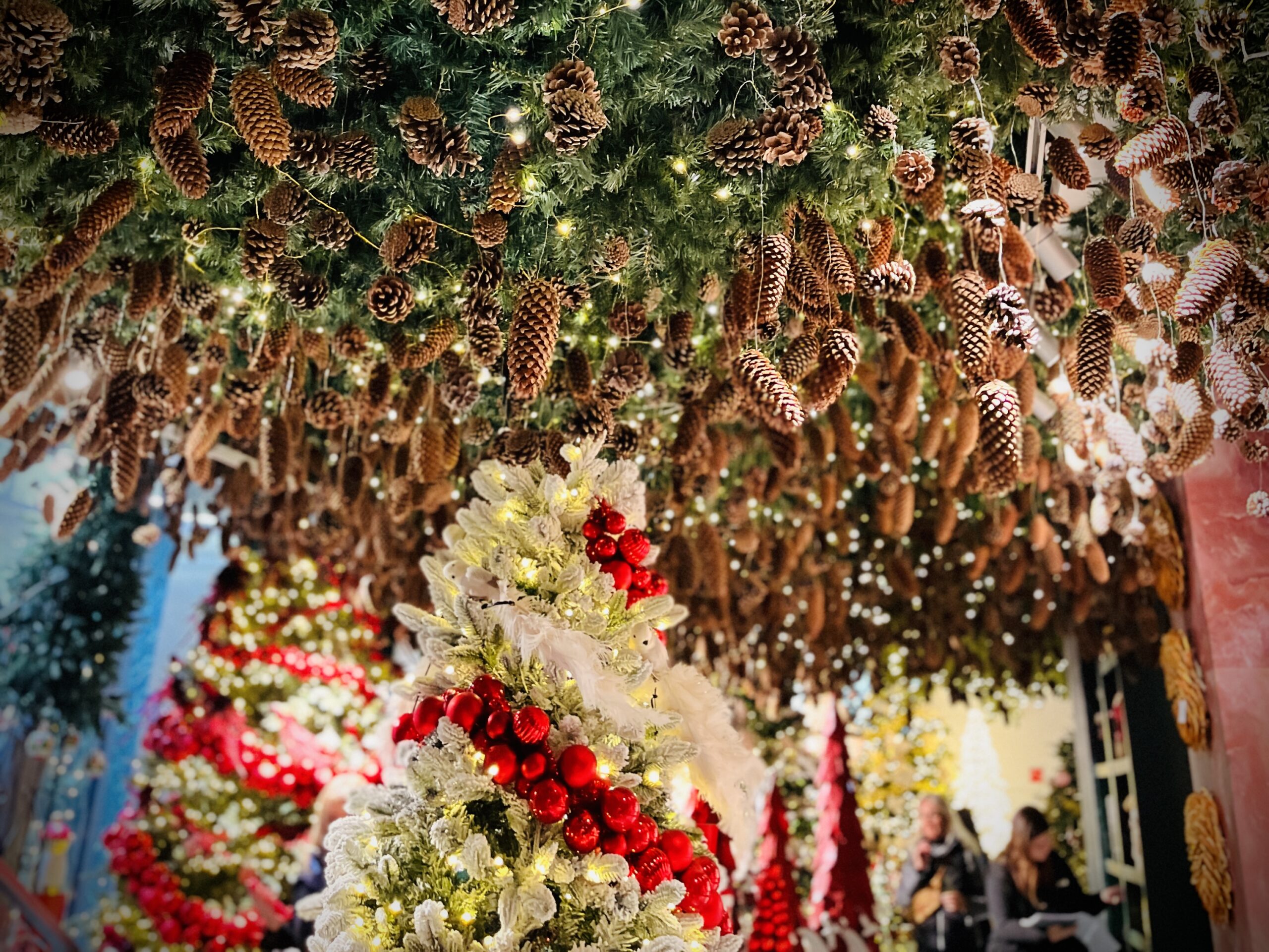 店内は、大きなクリスマスツリーが点在し、天井には松ぼっくりや緑が生い茂り、森の中に迷い込んだ幻想的な空間になっているのです。