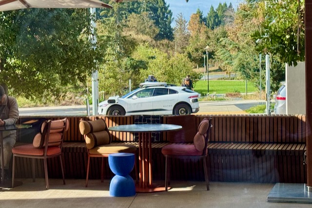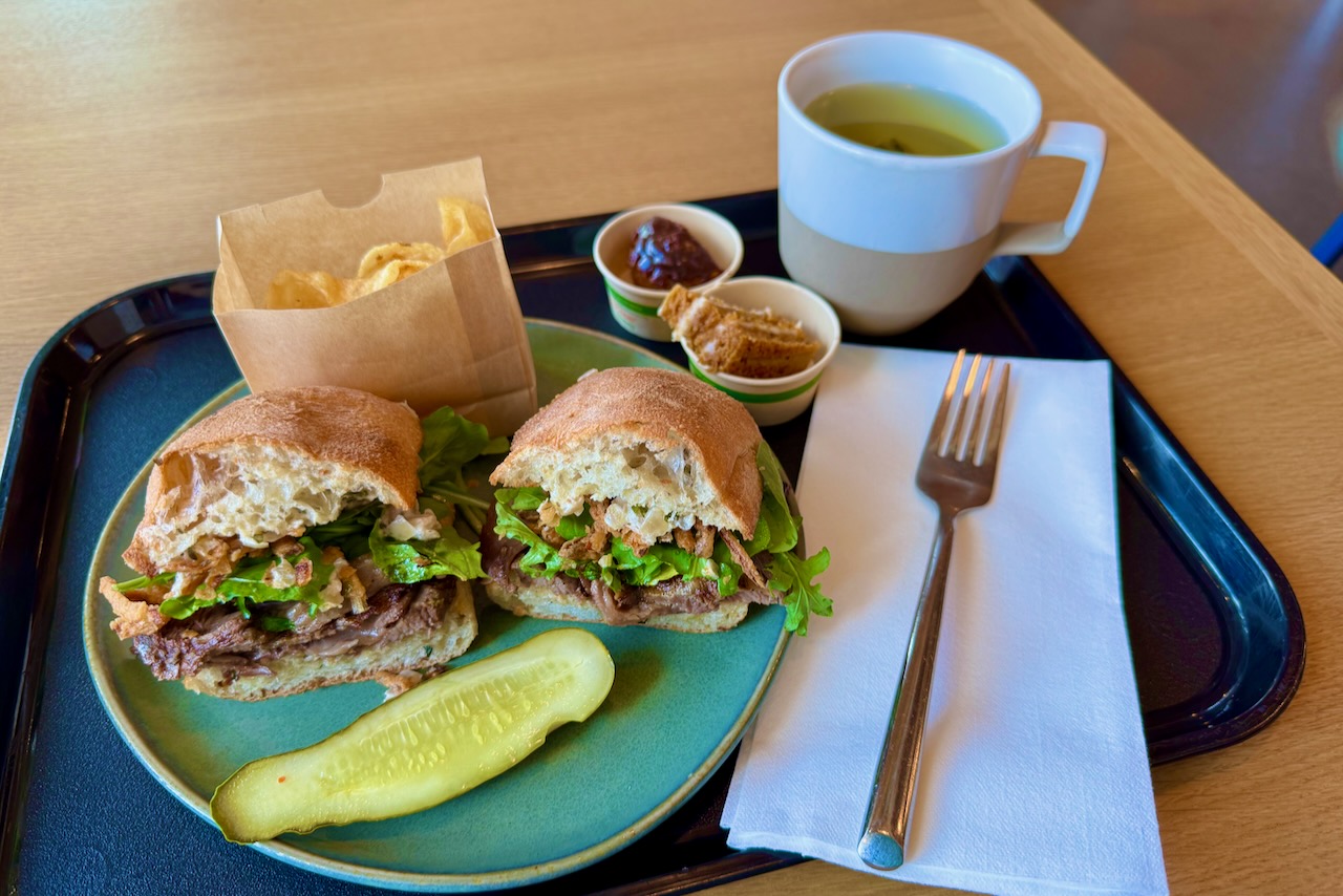 隣のカフェ「カフェ@マウンテンビュー(Cafe @ Mountainview)」。食への意識も高いエリアなので、ヘルシーで素材の良さが抜群な上に、案外お安いのには驚きます。「カフェ・ステーキサンドイッチ(The Cafe Steak Sandwich)」は、フランク部分の薄いステーキで、チミチュリ系グリーンソース。かぶりつきピクルスはいい漬かり具合で、紙袋入りポテトチップスは持って帰れるようにしています(油っぽくなく持って帰りたくなる)。これが一番高かくて14ドル!