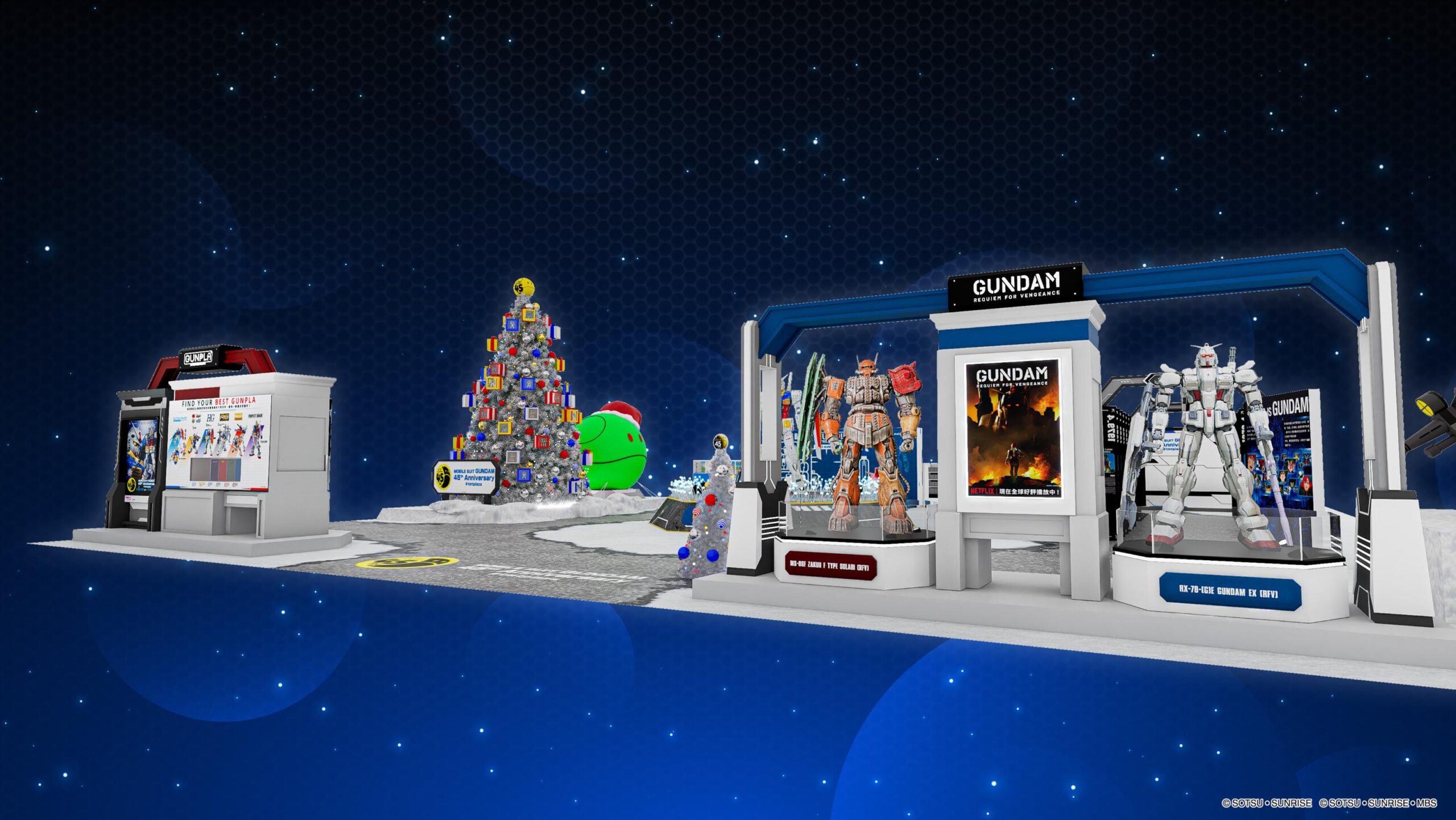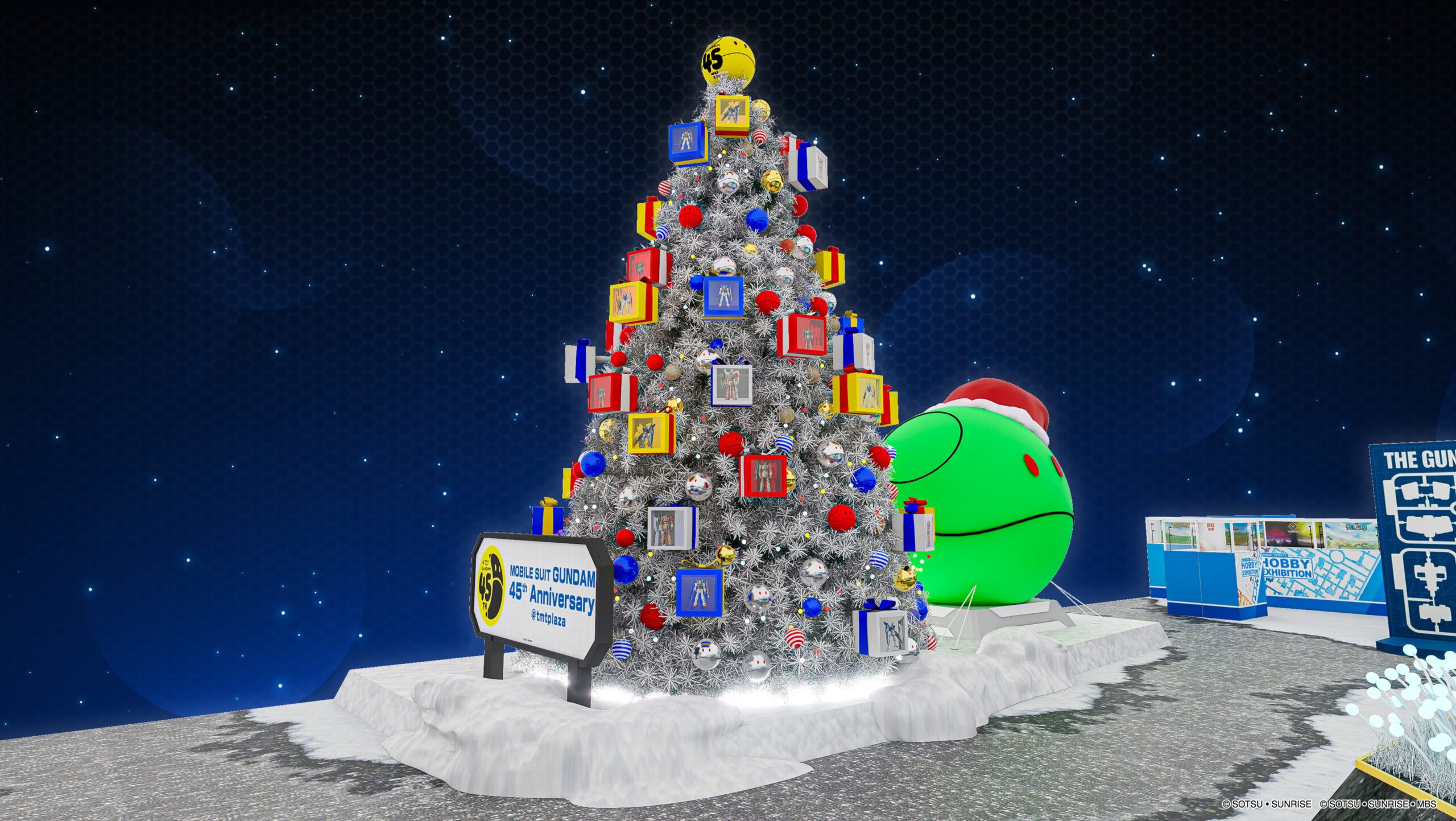 クリスマスが近づいているので6.3メートルのクリスマスツリーも飾られているが、45周年ということで45個のガンダムのフィギュアを飾り付けらるほか、さまざまなテーマの背景が選べる自撮りカメラスポットもあります。ショップでは、100体以上のガンプラも販売。そのうち40体以上は限定品になる予定です。