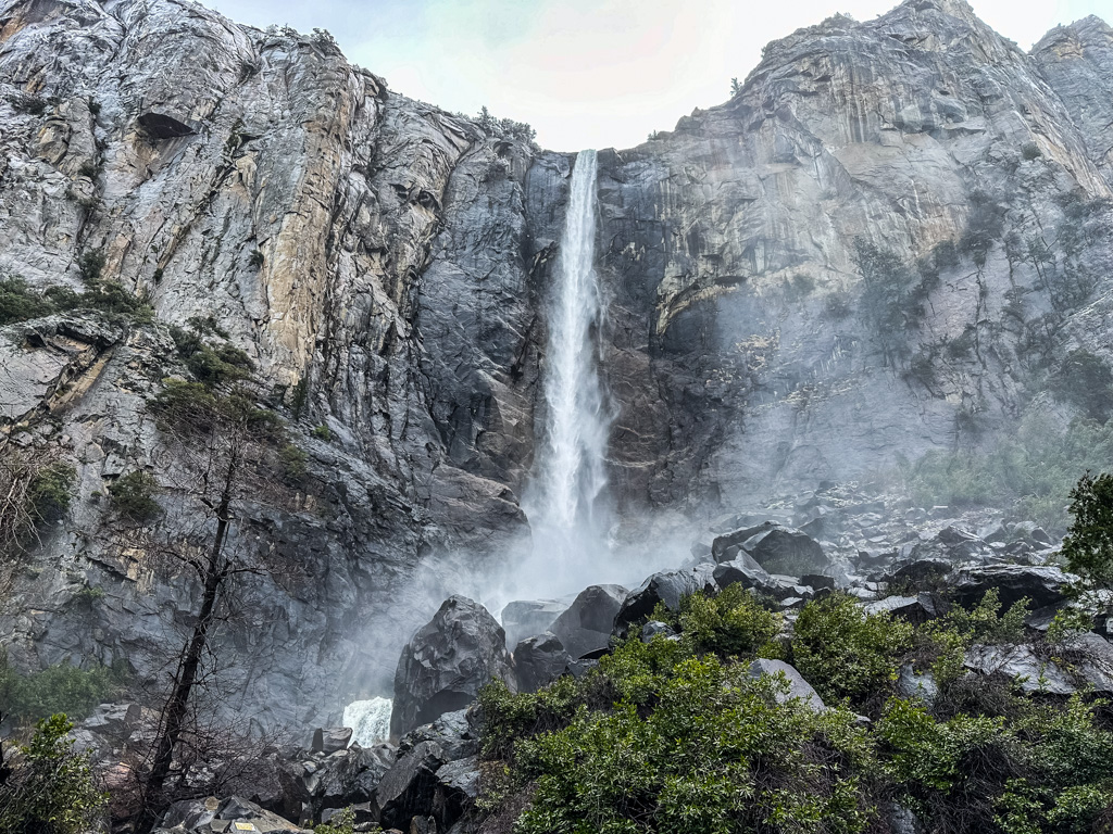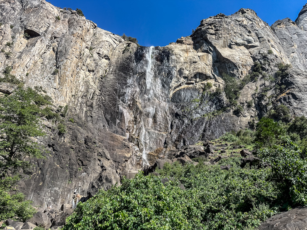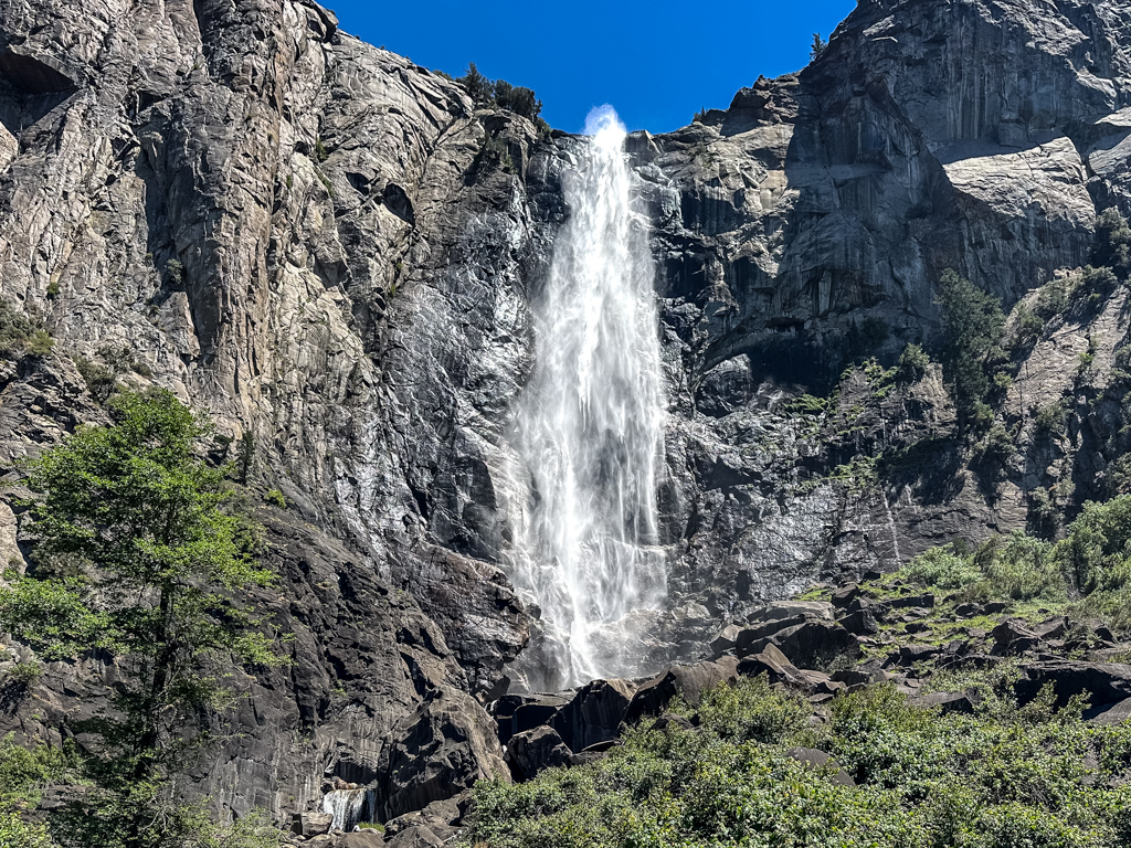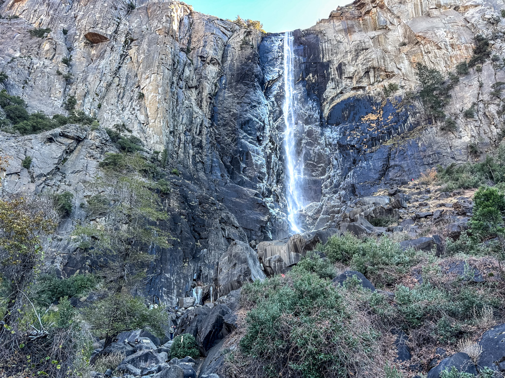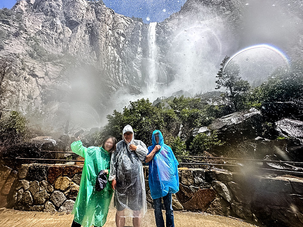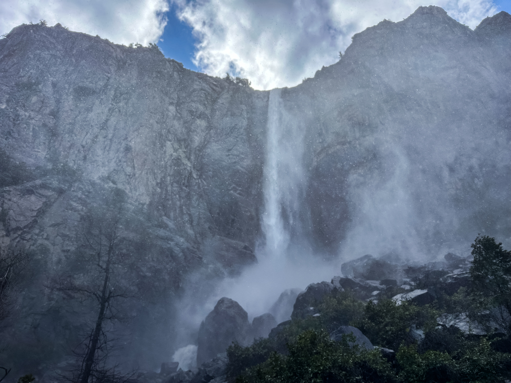 トンネルビューから目の前に見えるブライダルベール滝(Bridalveil fall, 189m)です。1年を通して水が枯れることは無いです。4,5,6月が水量は最大になり、滝つぼ下の展望台ではずぶぬれになるので、ポンチョが必須です。2、3、4月、11月12月には、散策路が凍りつく事が有るので、靴に被せる簡易スパイクが有ると安全でお勧めです。