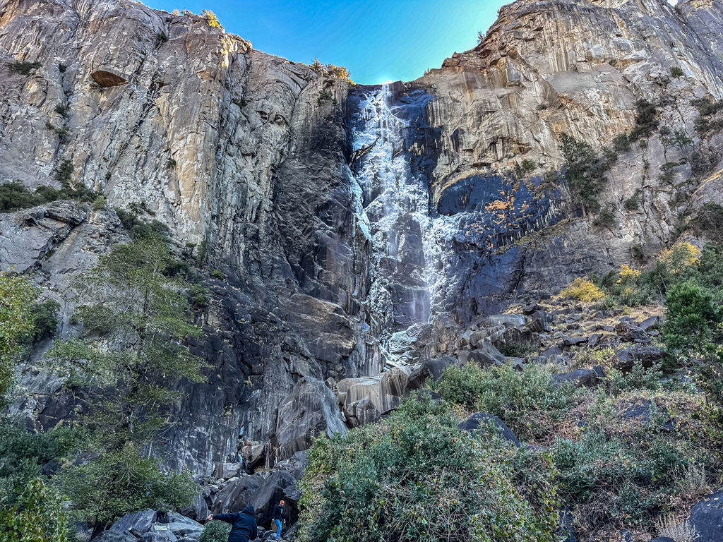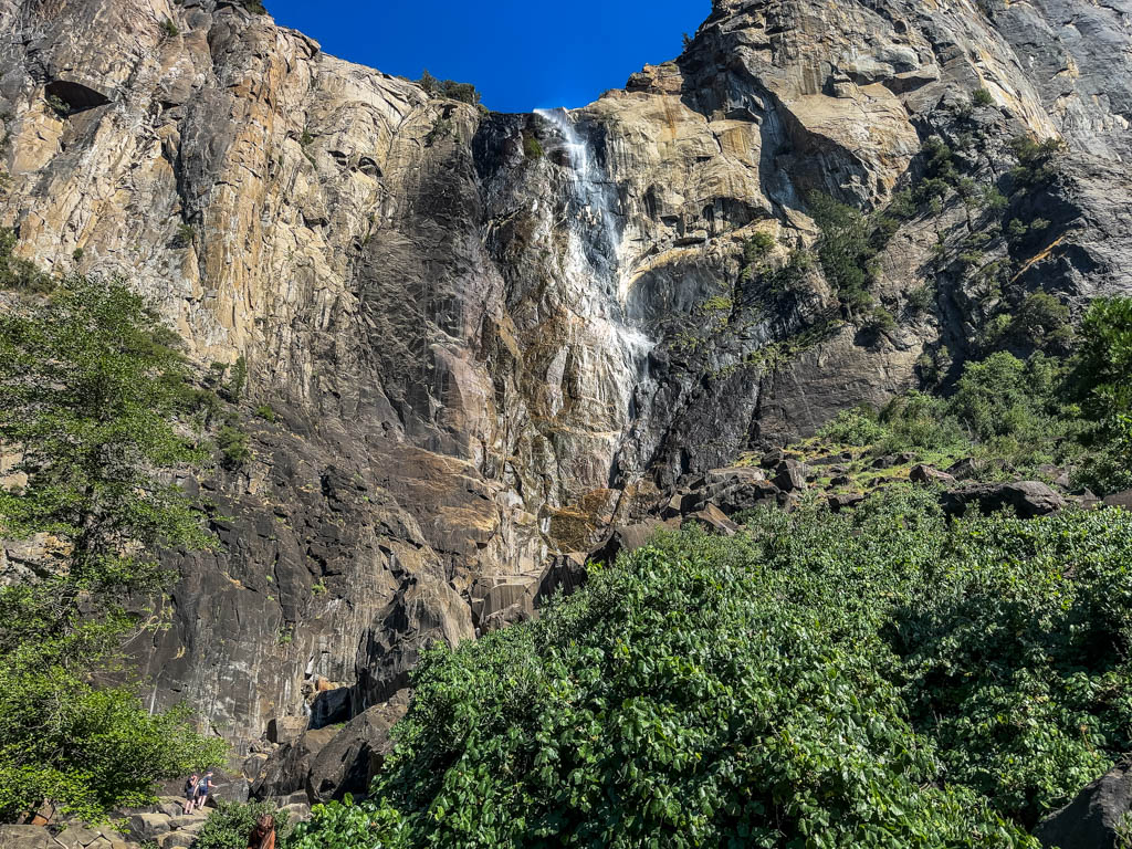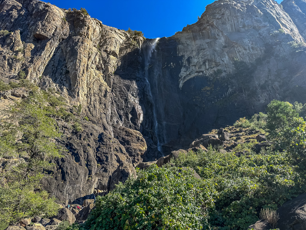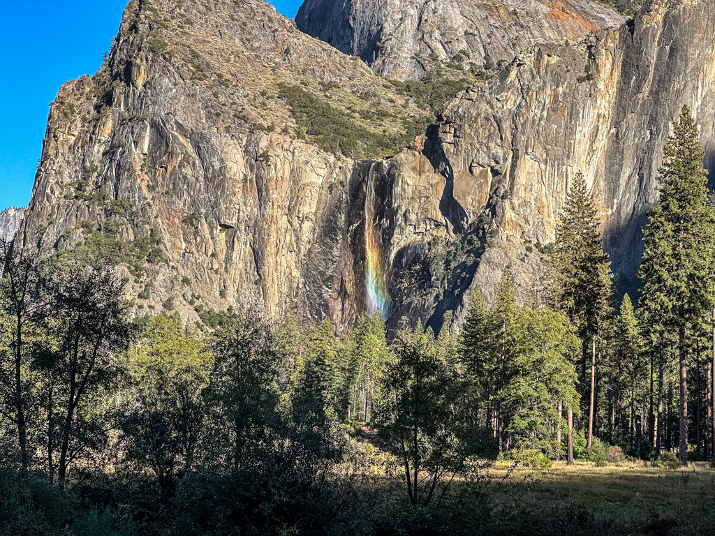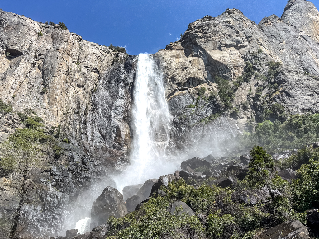 トンネルビューから目の前に見えるブライダルベール滝(Bridalveil fall, 189m)です。1年を通して水が枯れることは無いです。4,5,6月が水量は最大になり、滝つぼ下の展望台ではずぶぬれになるので、ポンチョが必須です。2、3、4月、11月12月には、散策路が凍りつく事が有るので、靴に被せる簡易スパイクが有ると安全でお勧めです。