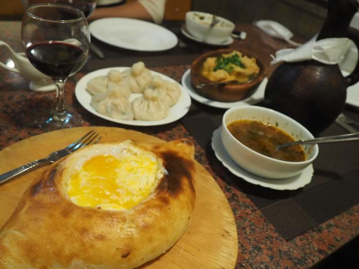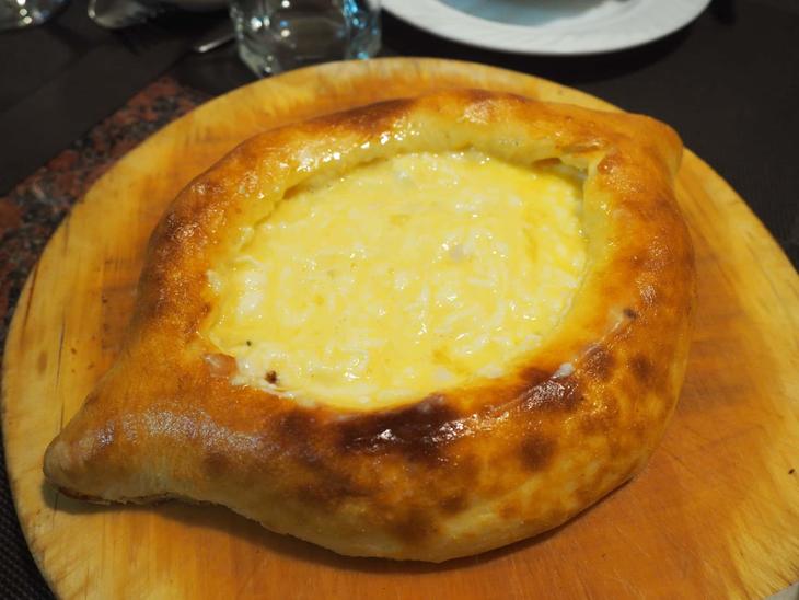 チーズ入りパンのハチャプリ(Khachapuri)は、ジョージアの各地域によって見た目や味が異なる興味深い料理です。おすすめは舟形の生地の真ん中にチーズと卵がのったアジャリア風ハチャプリ(Ajarian Khachapuri)です。