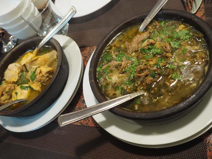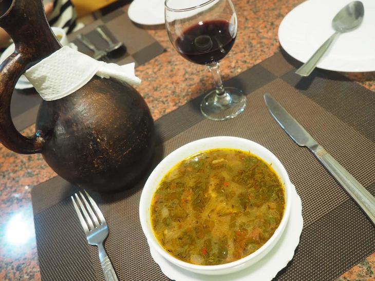 私がいつも注文する料理は、ハルチョー、ヒンカリ、ハチャプリ、そしてシュクメルリ。ハルチョー(Harcho)はトマトベースでお肉やスパイスをふんだんに使った、ジョージア料理のスープの代表選手。ほかの国のどのスープにも似ていないような香り高い味で、一度飲むとクセになってしまうはず。