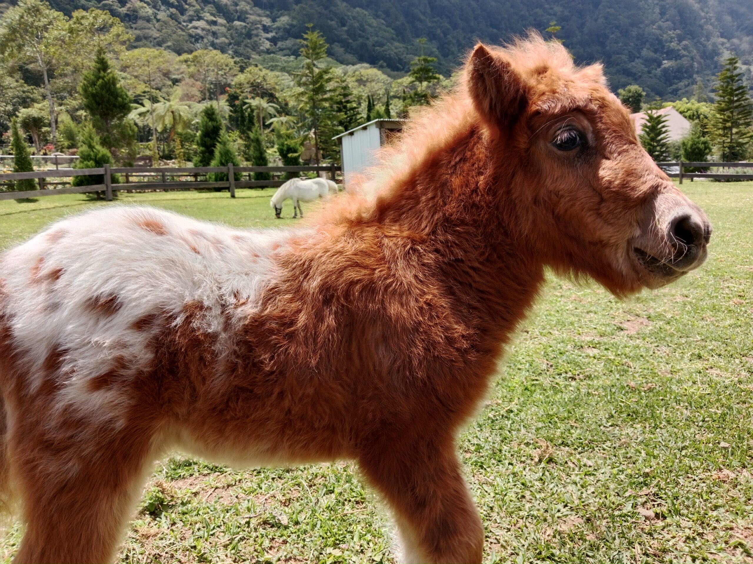 この日は、可愛いポニーが無邪気にのんびり、お母さんポニーと一緒にいました。後ろに見える美しい白馬(ポニー)が、お母さんです。近くに来たら直接触る事も出来ます。動物好きの友人達も大喜びです。勿論、私も笑