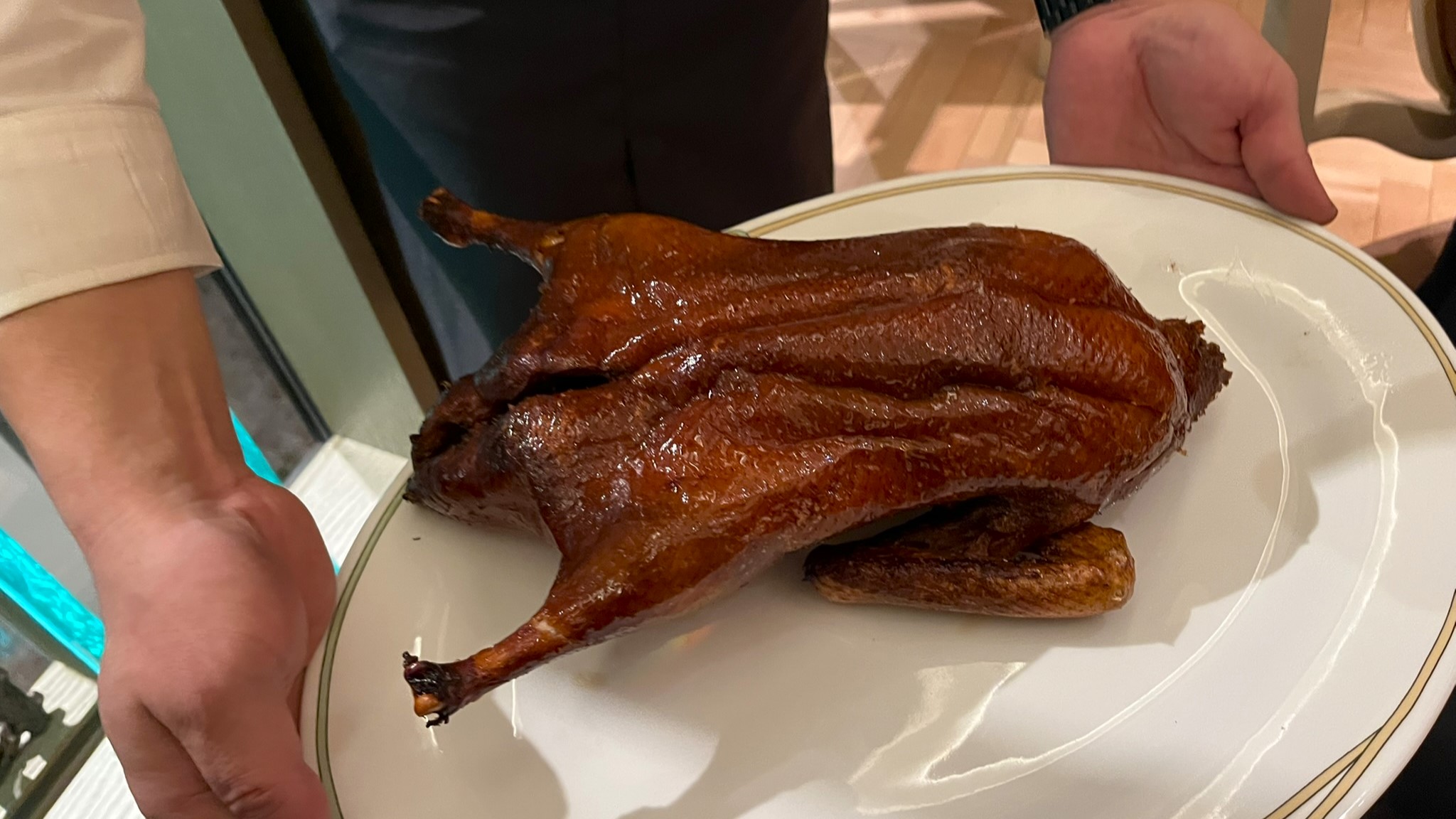 焼き立て北京ダックです。最初にそのままを見せて頂き、お店の方で切り分けてネギなどと一緒に皮で包んで出てきます。
