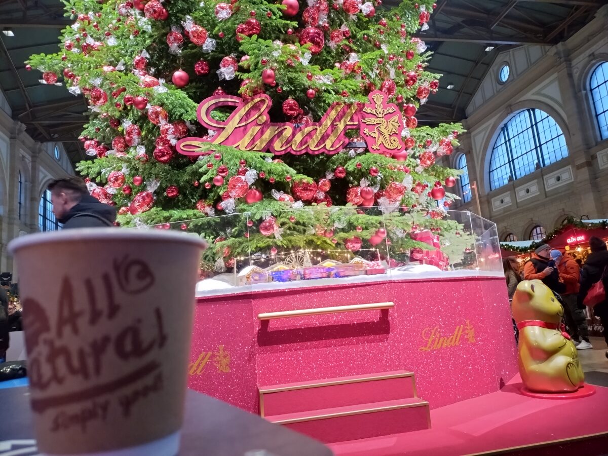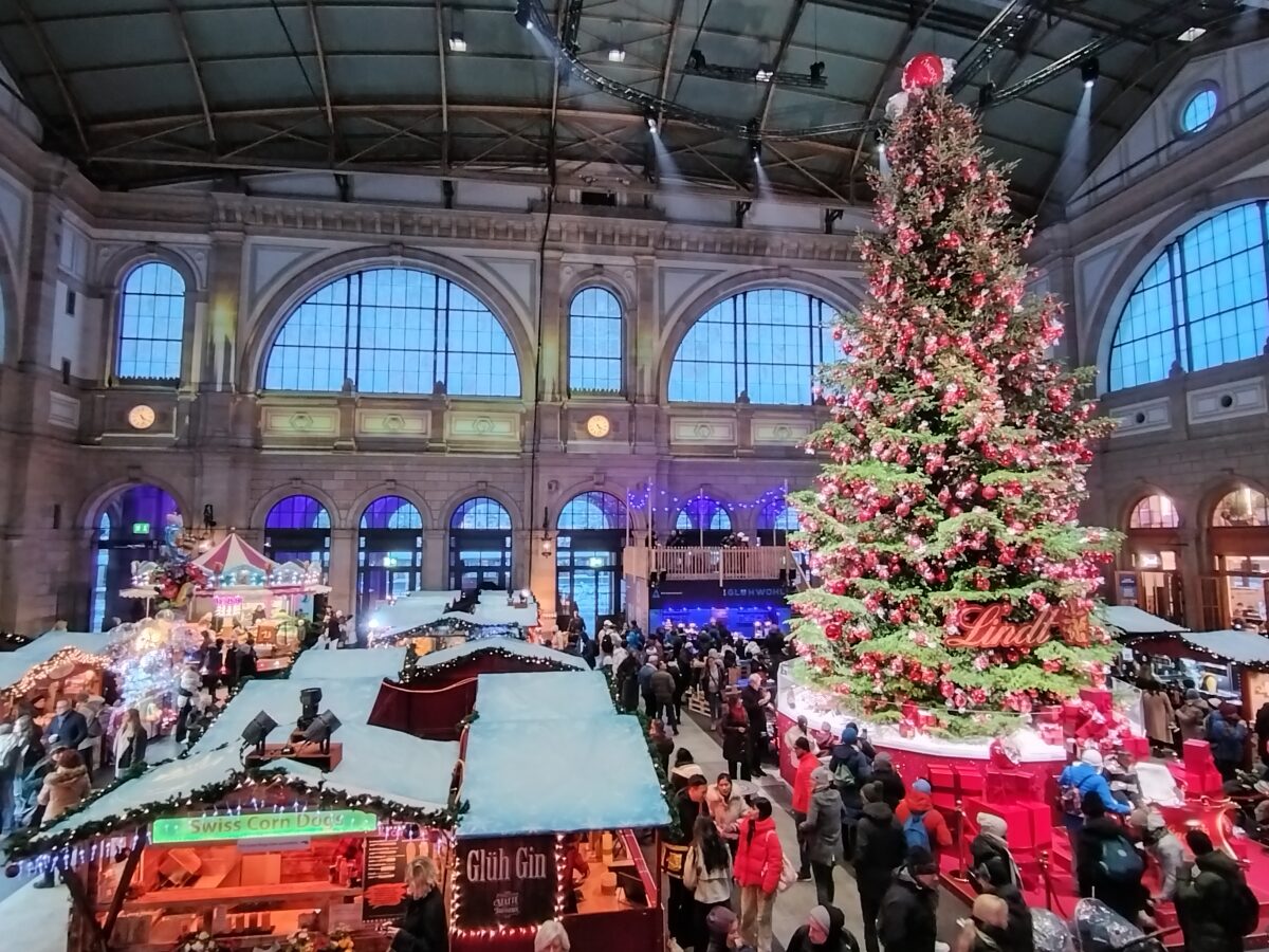 Hauptbahnhof(チューリッヒ中央駅)のリンツチョコレートツリーが目玉のマーケットも必見。ここでは地元の職人が作るアイテムや伝統的なスナックを楽しめます。おすすめはホットワイン(Glühwein)やソーセージです。