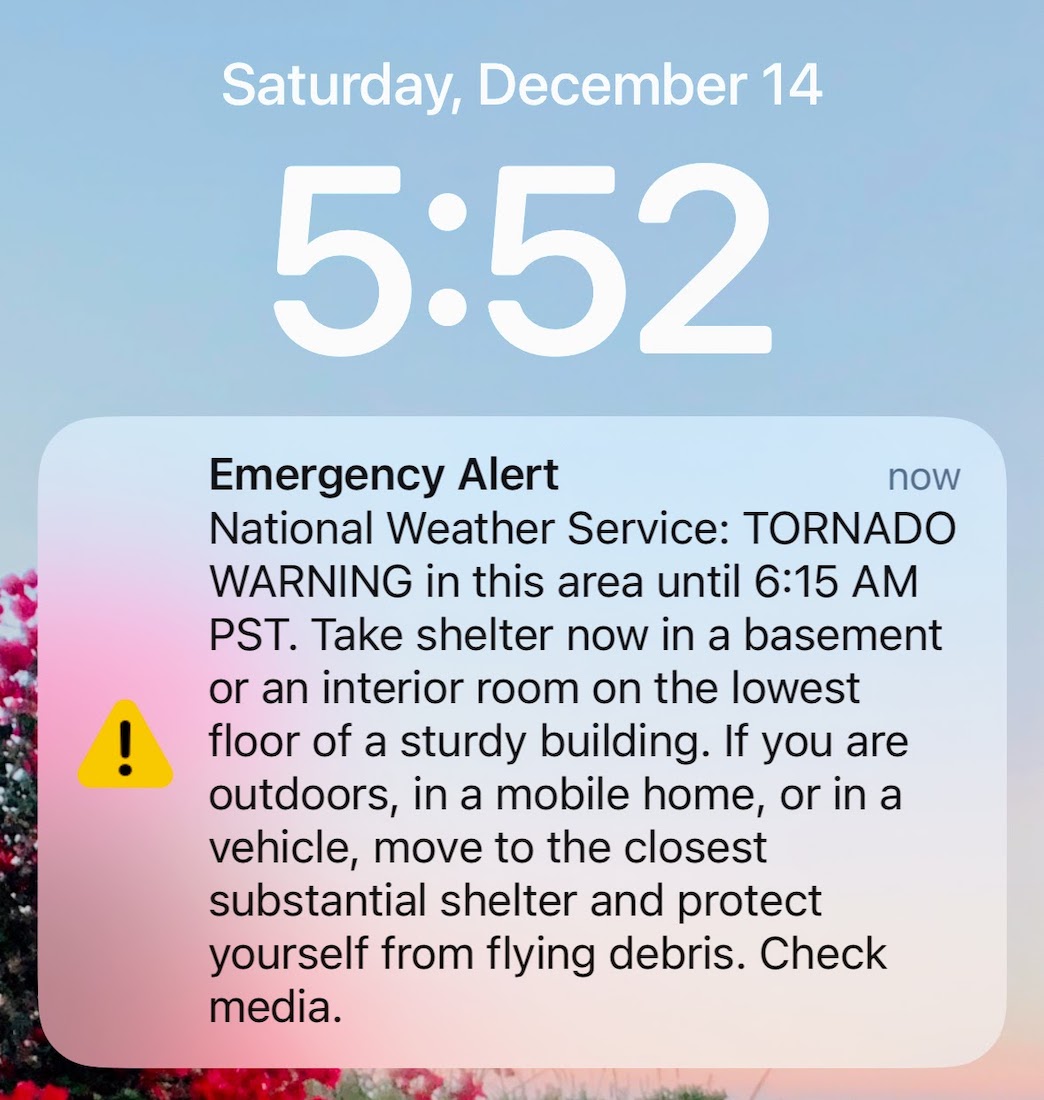 先週のコラムでお伝えしたように、土曜日は嵐が予報されていたベイエリア。その土曜日12月14日の早朝、5時44分、各スマホに緊急アラートとして竜巻警報が届きました。内容としては午前6時15分まで、竜巻に警戒せよ、というもの。地下室などのシェルターに避難することが奨励されていました。多くの市民はまだ睡眠中で、このアラートによって起こされた状態となりました。