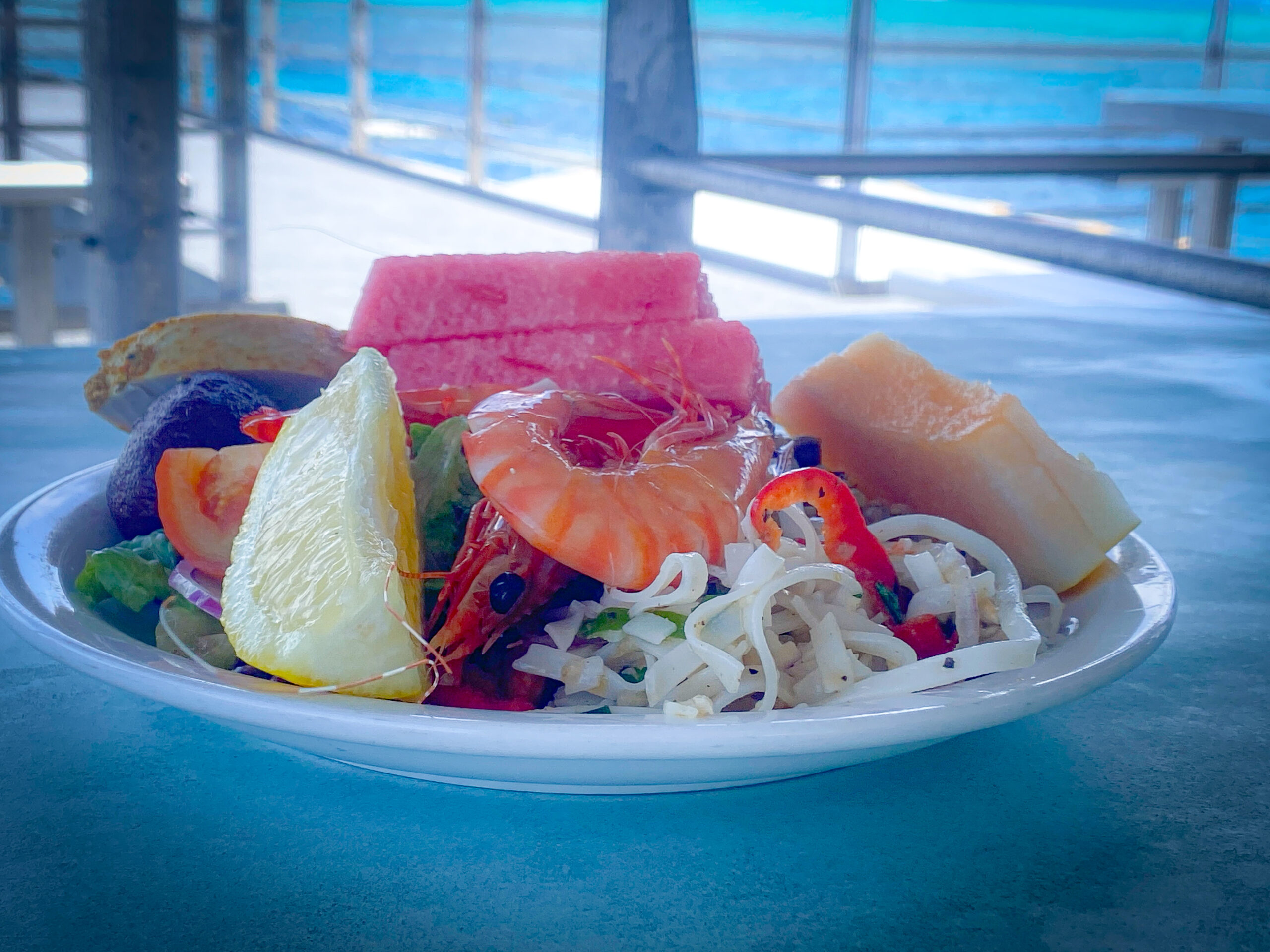 船内ではおしゃべりしたり、写真を撮ったり、外に出て風に吹かれたり。思い思いに過ごしていますが、ポントゥーンに到着する前に、船内ではランチタイムに突入します。ランチはビュッフェ形式で、新鮮な海鮮やサラダ、フルーツなどのバラエティ豊かなメニューが揃います。