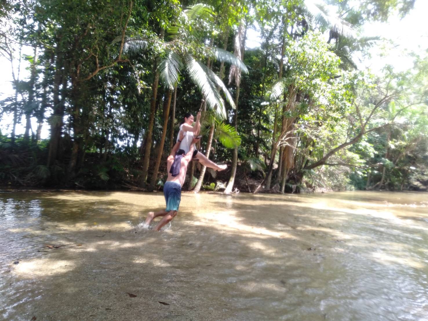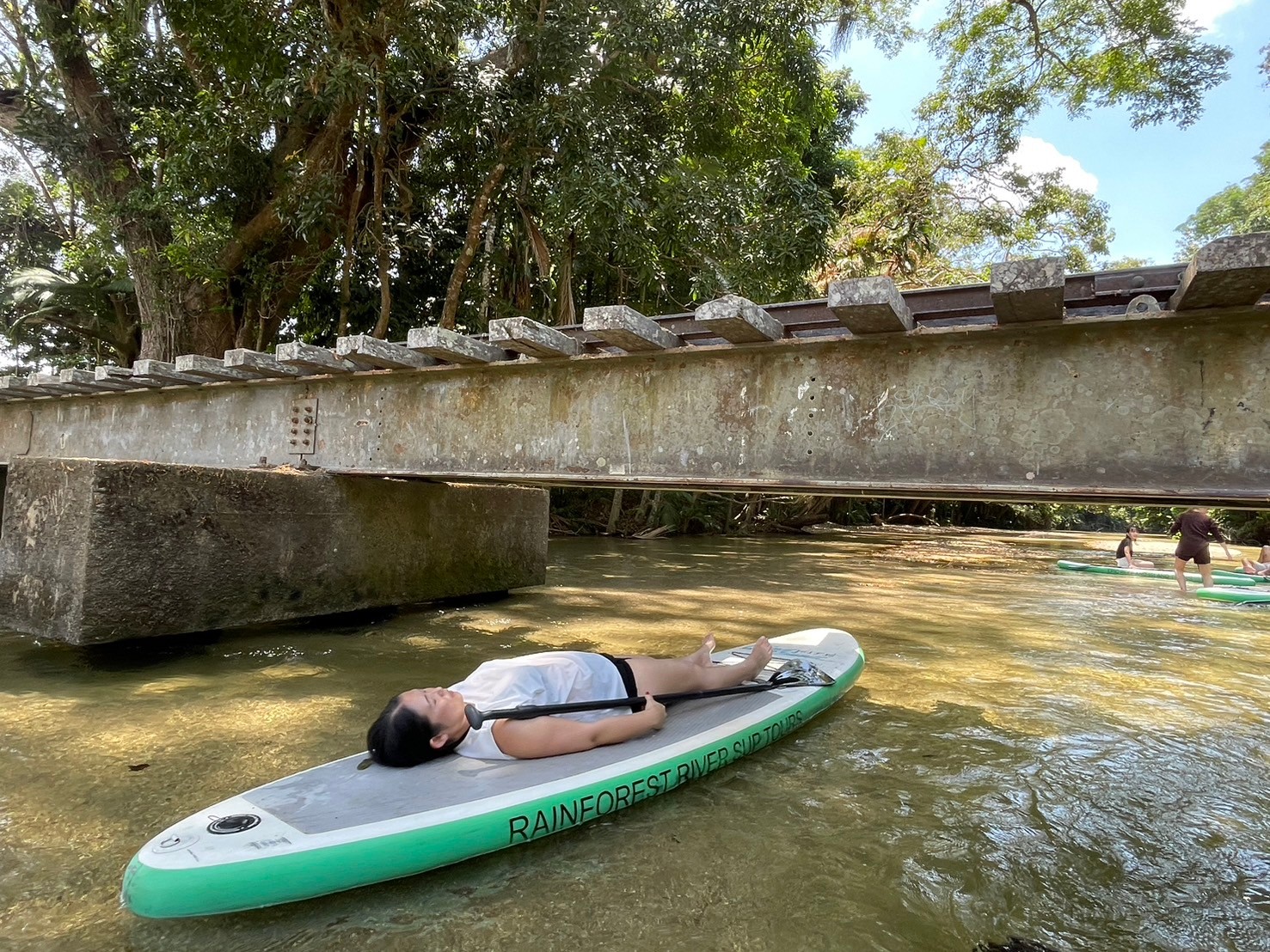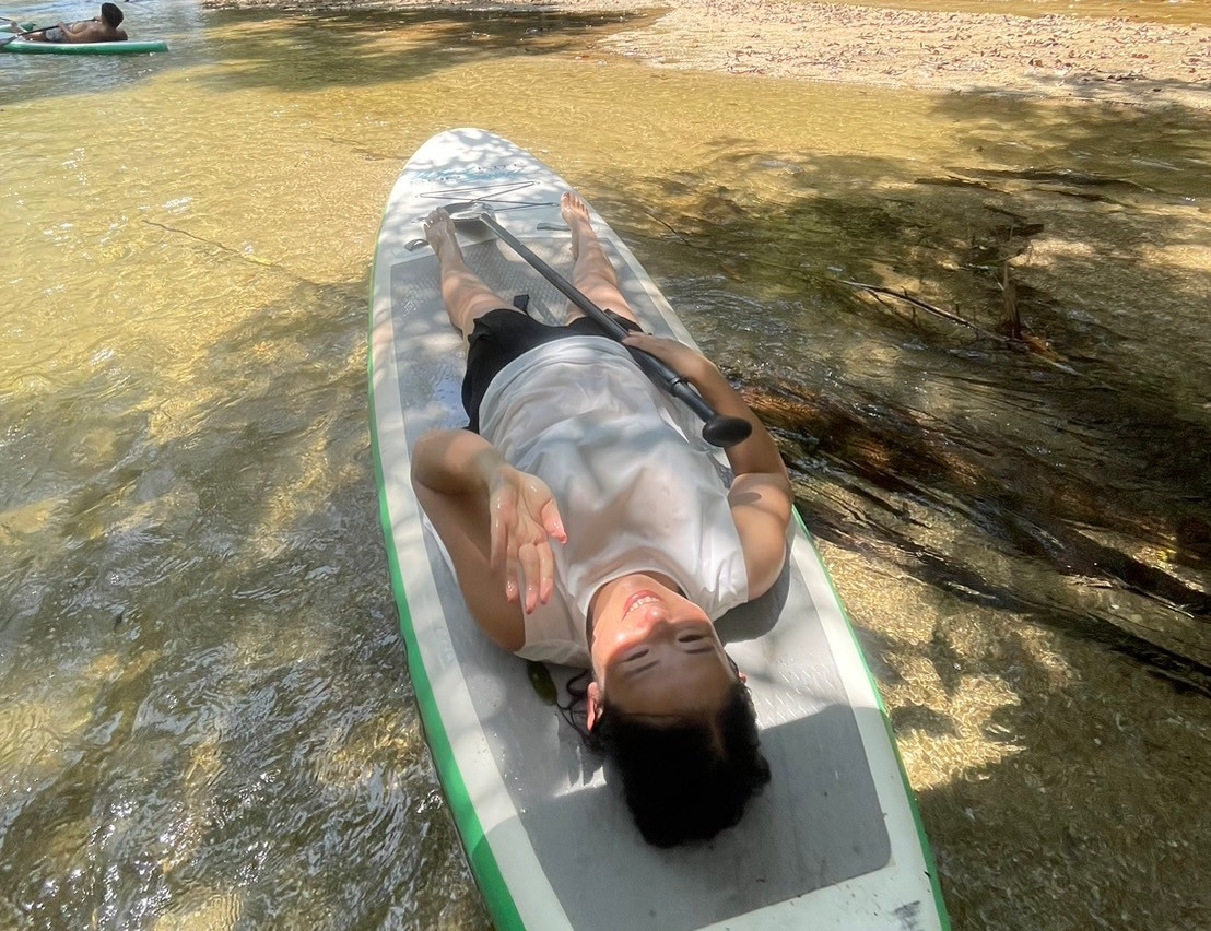 慣れてきたらボードの上に立ってみたり、寝転んでみたり。熱帯雨林の合間から漏れる、木々の光を見ながら、ゆったり川下りを楽しめます。