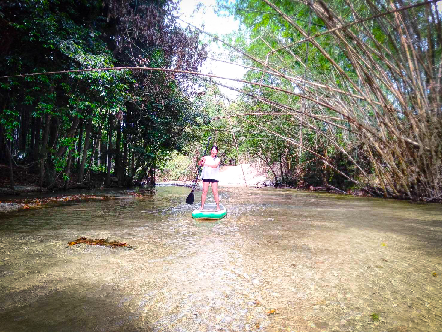 最初は座って漕ぎ出す人が多いのですが、安定してきたらボードの上に立ってみましょう。重心がブレないように注意しながら立つのがポイント。仮にバランスを崩してしまっても、川が非常に浅く、くるぶしの少し上ほどの水深なので安心して挑めます。