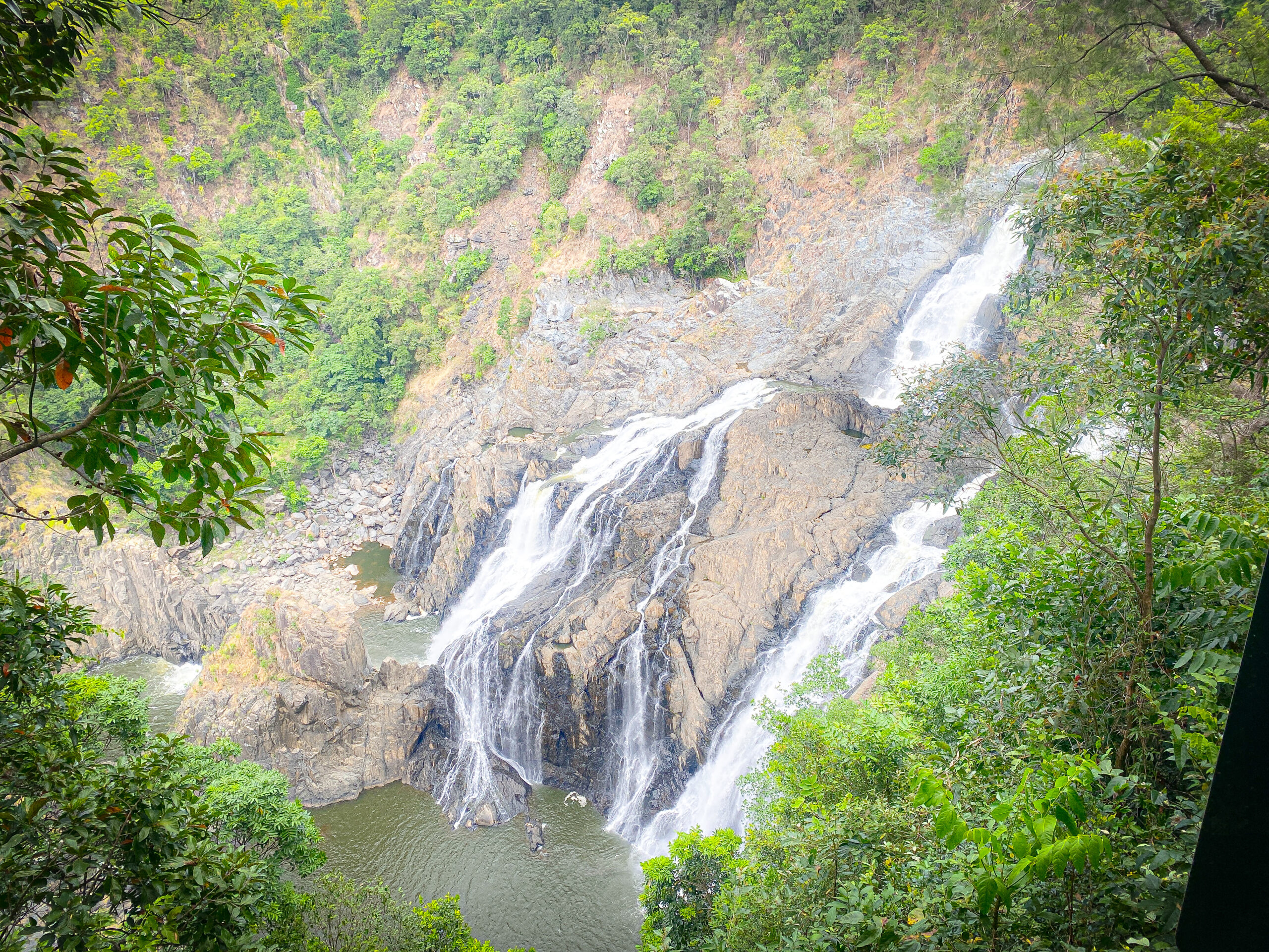バロンフォールズ駅で下車して、ガラス張りの「ザ・エッジ」展望台へ向かうと、豪快に流れるバロン滝を見ることができます。この日は、水量が少なめでしたが、大雨の日の翌日は水量が一気に増えて、かなり迫力があるんだそう。展望台側から滝を眺めると、観光列車「シーニックレール」を遠くに見ることができます。よく見ると、滝の前で停車して撮影時間を設けている様子。わざわざ停車している様子から、バロン滝の人気ぶりが伺えます。