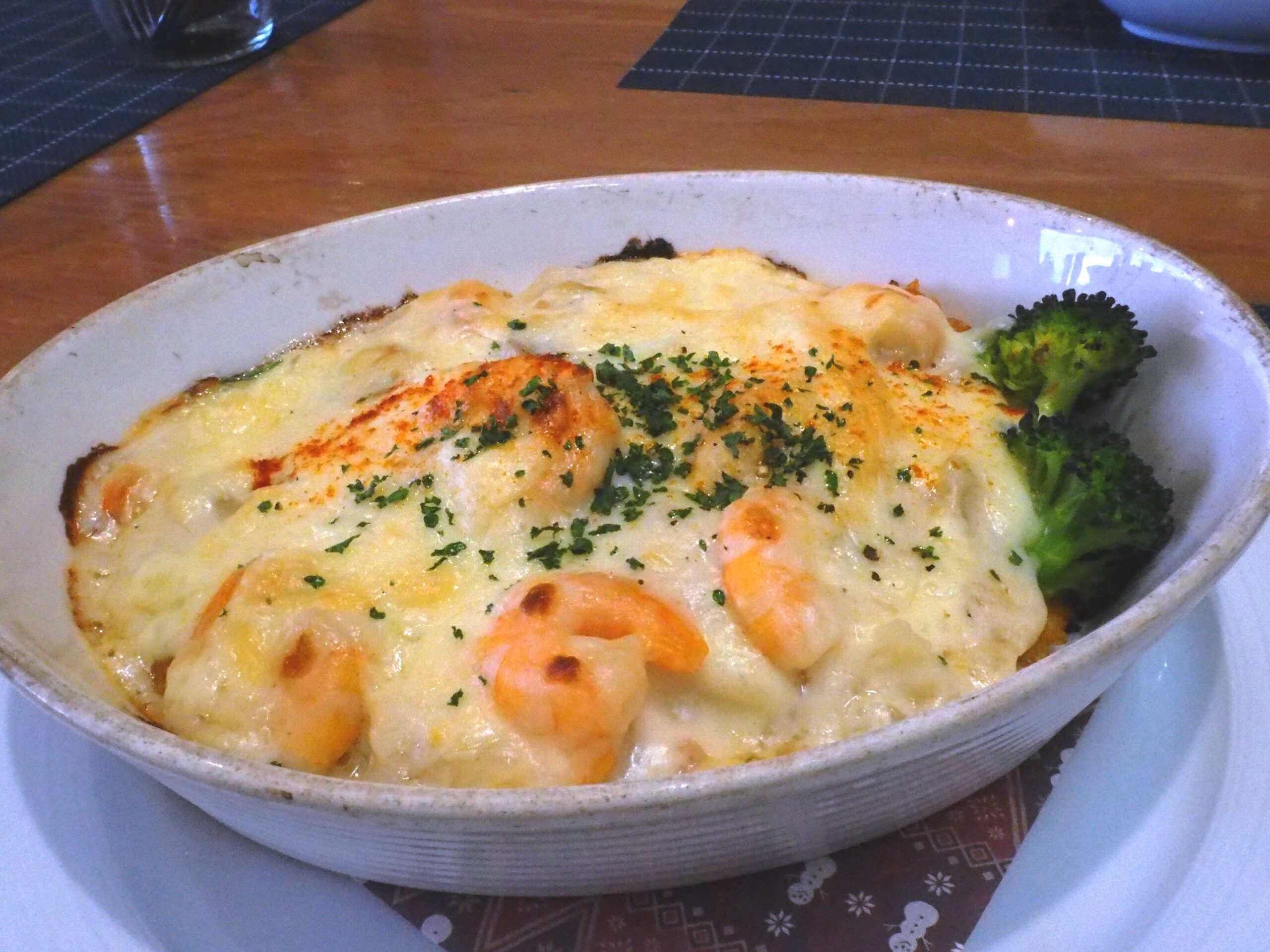 メインのシーフードドリアがやってきました。ぐつぐつと煮えたぎっていて猫舌の私にはちょっと、冷まして食べないと無理そうですが、これ、けっこうな量がありますよ。でも、クリーミーで美味しくて、いくらでも食べられます。最後に少しだけ夫に手伝ってもらいましたがね。