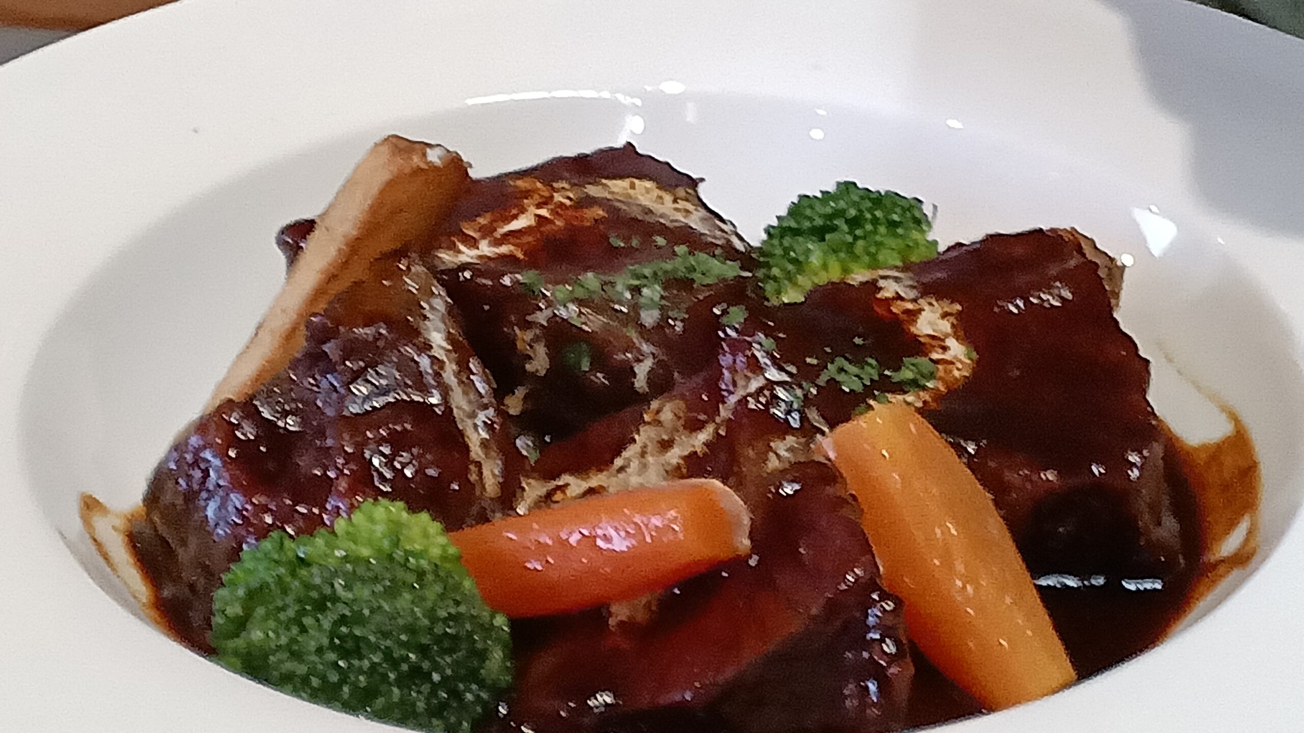 夫がオーダーしたビーフシチューもやってきました。こちらもボリュームがあります。写真はズームしているので判りにくいのですが、ビーフは200gはあると思います。お肉が大きく切られていてシチューというよりも、ステーキにデミグラスソースをかけたという表現がピッタリです。