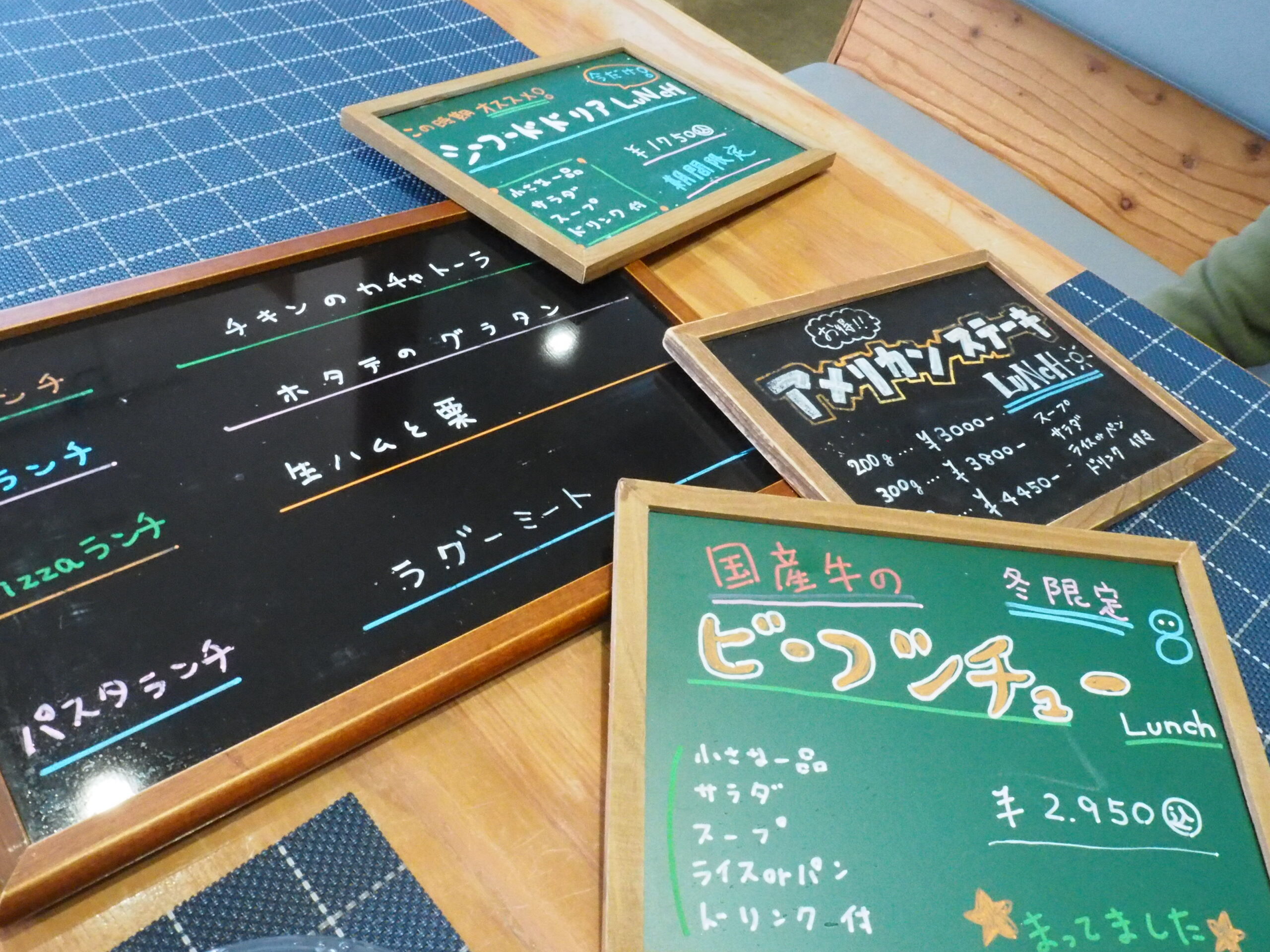 席に案内されるとメニューの書かれたブラックボードが出てきました。シーフード好きな私はBランチの「ホタテのグラタン」と「シーフードドリア」と激しく迷いましたが、(シーフードドリアならホタテも入っているよね。)と勝手に納得しながら期間限定のドリアに決めました。夫は季節限定の「国産牛のビーフシチュー」です。