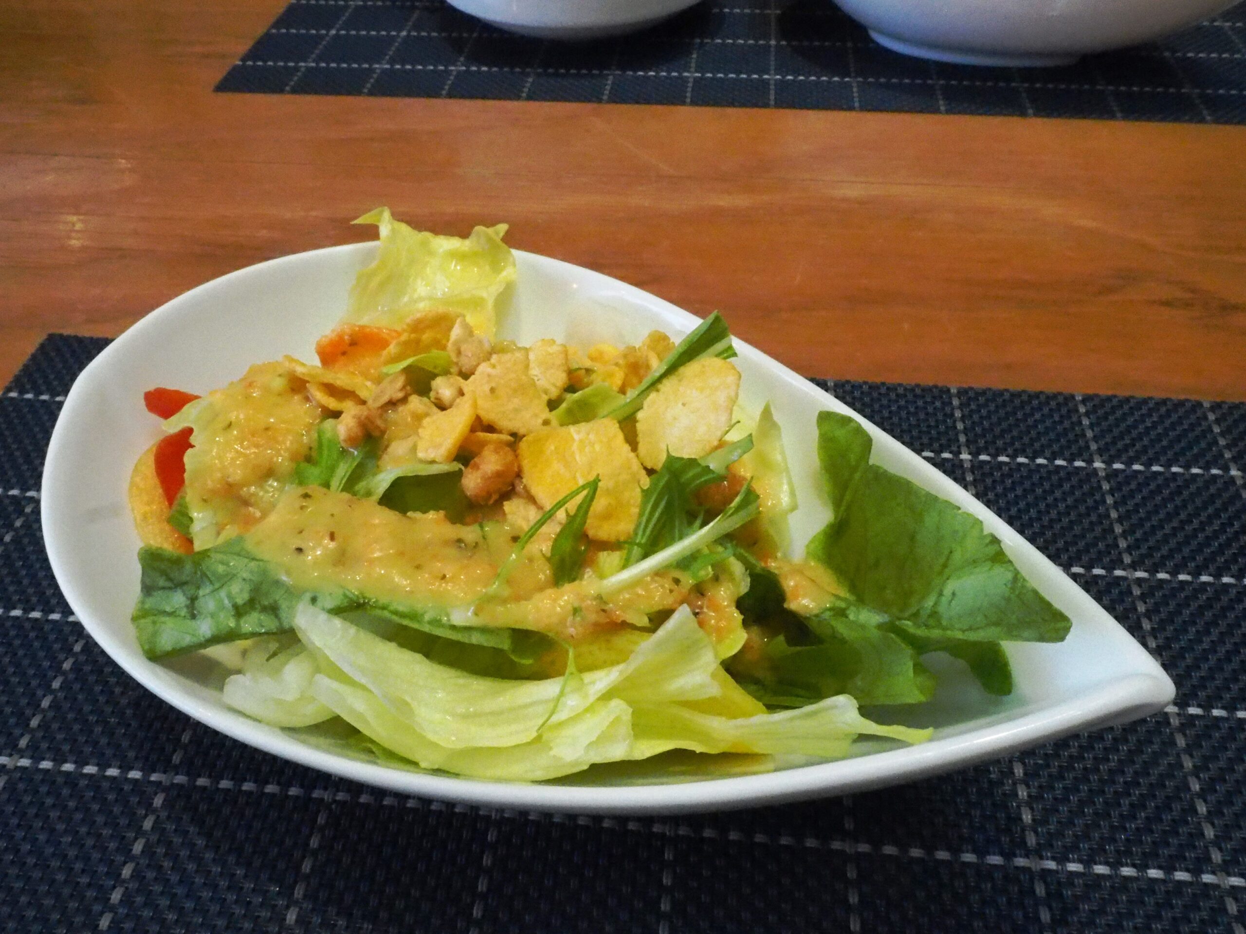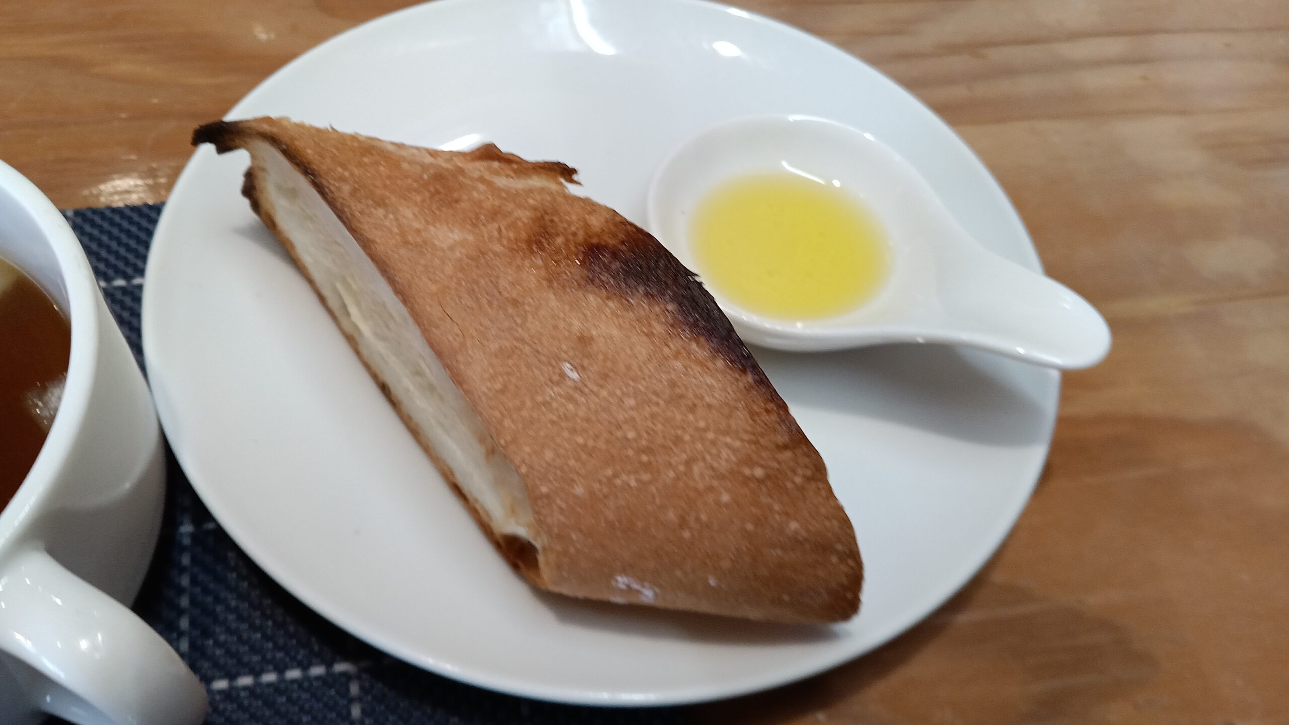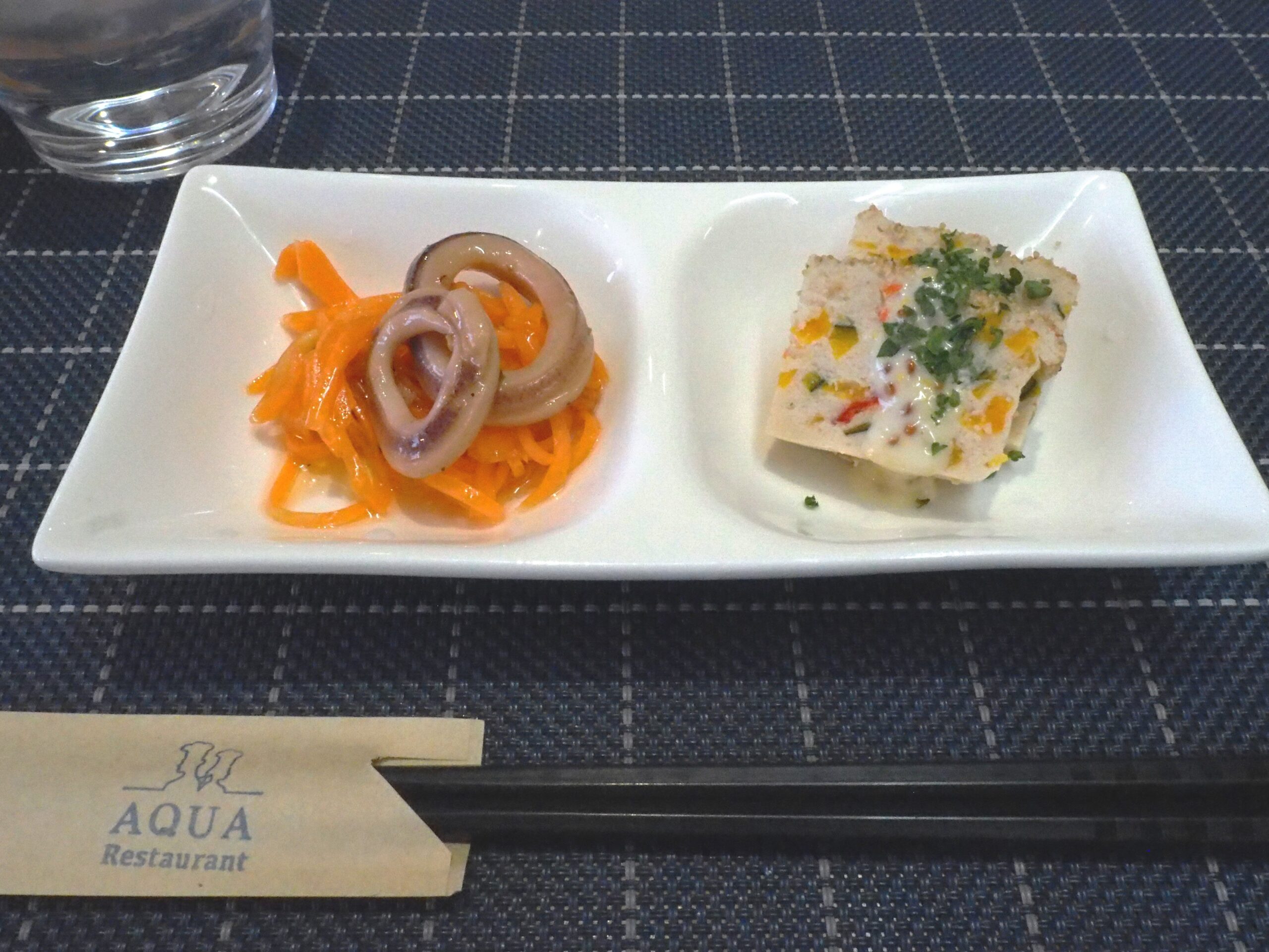 ほどなくアペタイザーがやってきました。のし鶏とイカのマリネ、キャロットラぺです。のし鶏は中に細かく切ったカボチャやパプリカが入っていて切り口が鮮やかです。キャロットラぺも香辛料が効いて食べやすく爽やかです。サラダは新鮮な野菜にドレッシングが美味しく、トッピングにもナッツやコーンフレークなどかかり、様々な食感が感じられるのがいいです。オニオンスープは玉ねぎの甘みをぎゅっと感じられます。