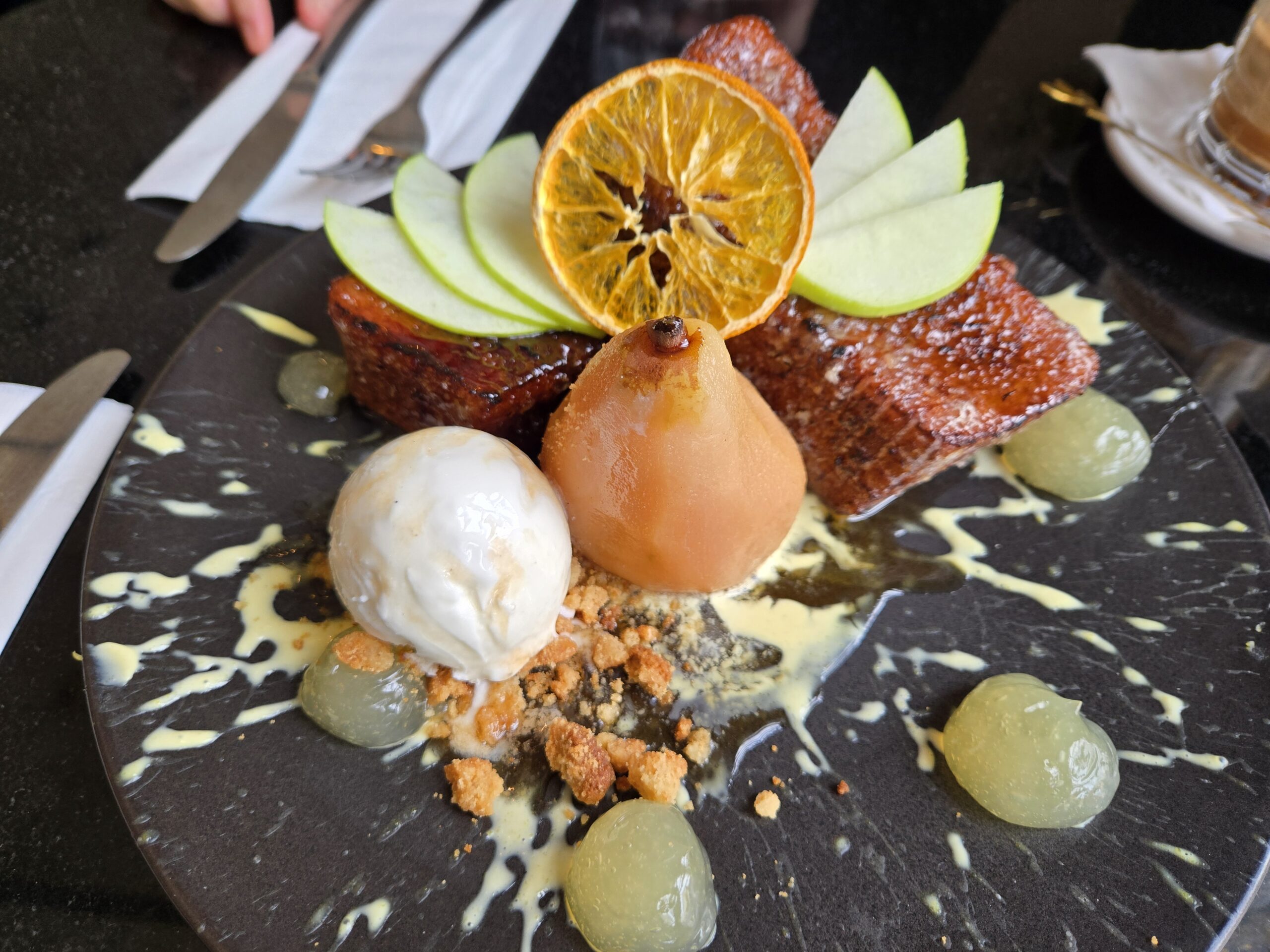 外はサクサク、中はふんわりと焼き上げられた甘いフレンチトーストの中心には、洋梨のシロップ漬けが贅沢に添えられています。