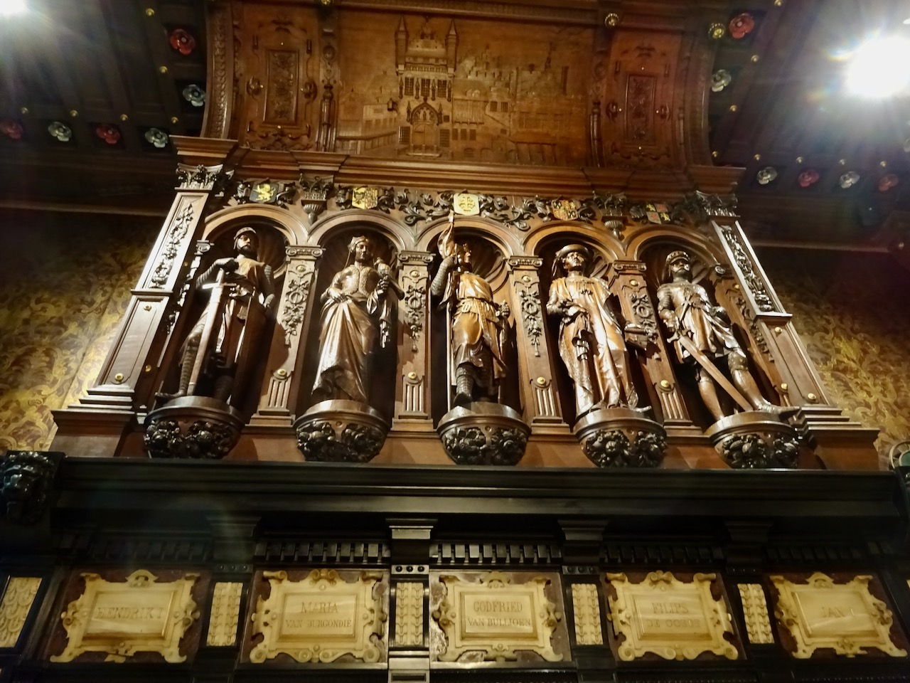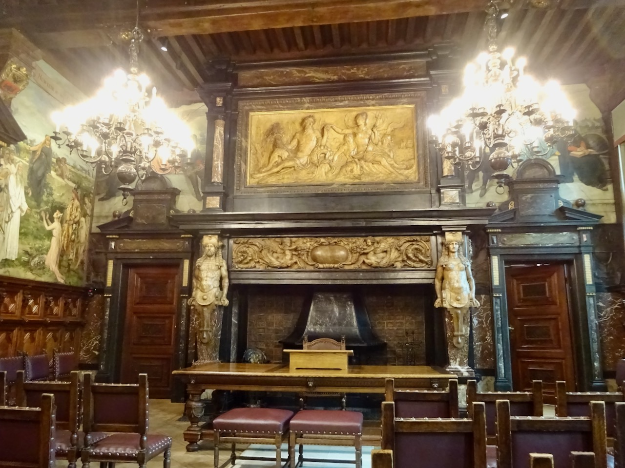 暖炉の上にある、オーク材で作られた象徴的な彫刻は、アントワープにとって重要な公爵たちを再現しています。彫刻家アルフォンス・ペータースが制作しました。その上には、1565 年の解体前の旧市庁舎の姿も再現されています。