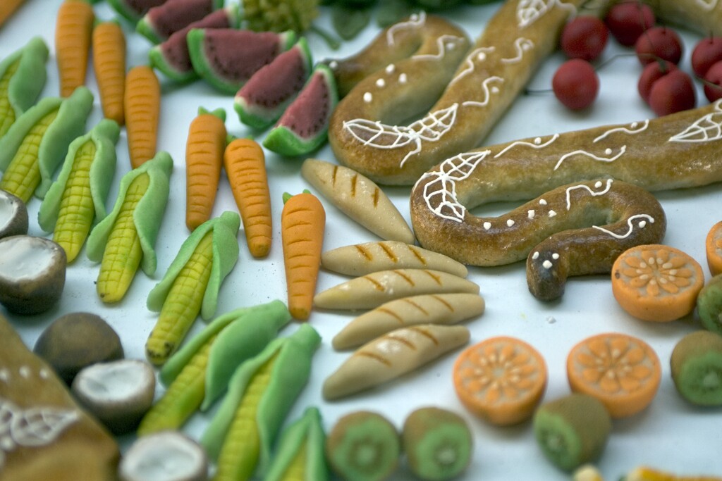 モカドラでは、男性から女性に野菜や果物を模った小さくてカラフルなマジパン(アーモンド粉と砂糖を練って作るお菓子)を、スカーフに包んで贈ります。男性から女性への一方通行であること、贈るものが決まっていることが日本のバレンタインデーに似ていませんか? 10月に入るとパン屋さんやお菓子屋さんのウィンドーがマジパンやスカーフで色鮮やかになります。伝統的習慣だからかマジパンを買う高齢の男性を見かけることもあり微笑ましいです。
