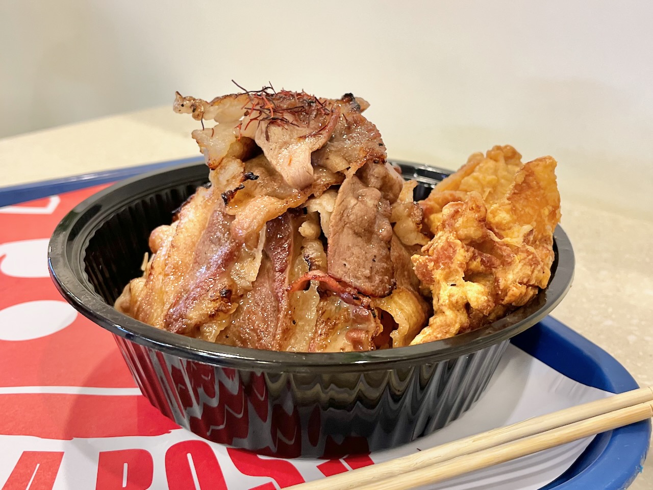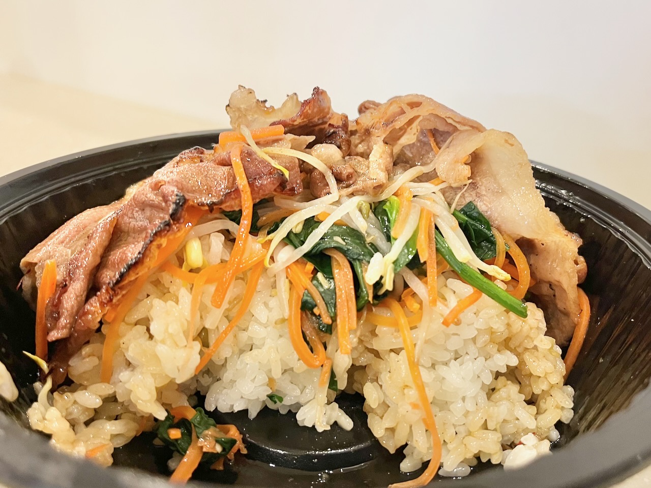 「GYU BOSS」のメインメニューの焼肉牛丼はサイズが選べ、チーズやキムチ、海苔、温泉卵、ガーリックなど自分好みにアレンジが可能。甘じょっぱいタレがよく絡み合い、香ばしく焼き上げたお肉はお米が止まらなくなるかも。ご飯の上にはほうれん草やにんじんのナムルが乗っているのは嬉しいポイント。一緒にいただくとさっぱりして最後まで美味しくいただけます。女性一人だと一番小さいミニサイズで十分なボリュームですが、唐揚げ2個とドリンク付きのお得なコンボメニューも。