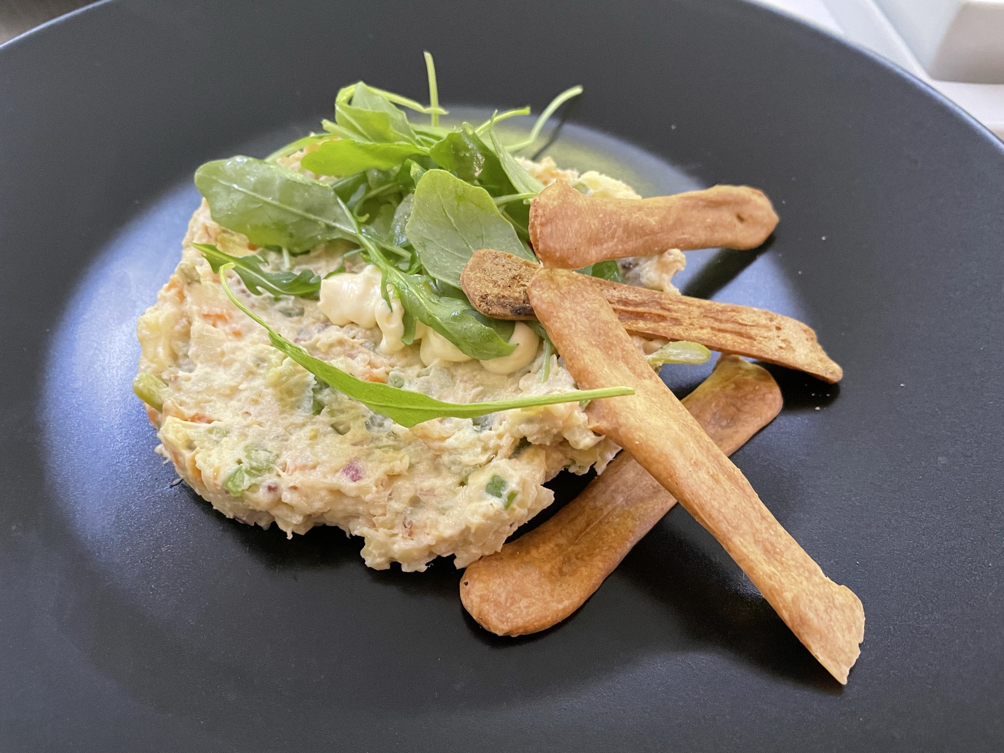 これはスペインの定番中の定番タパス。日本のポテトサラダとの違いは具材(にんじんやグリーンピースが基本でほかにはオリーブやピクルス、ツナなどを使います)や具材がほぼ同じ大きさにカットされていること、ポテトも同じ大きさでマッシュされていないこともあることでしょうか。マヨネーズは日本よりふんだんに使います。冷たい料理なので、夏のつまみにはぴったりです。
