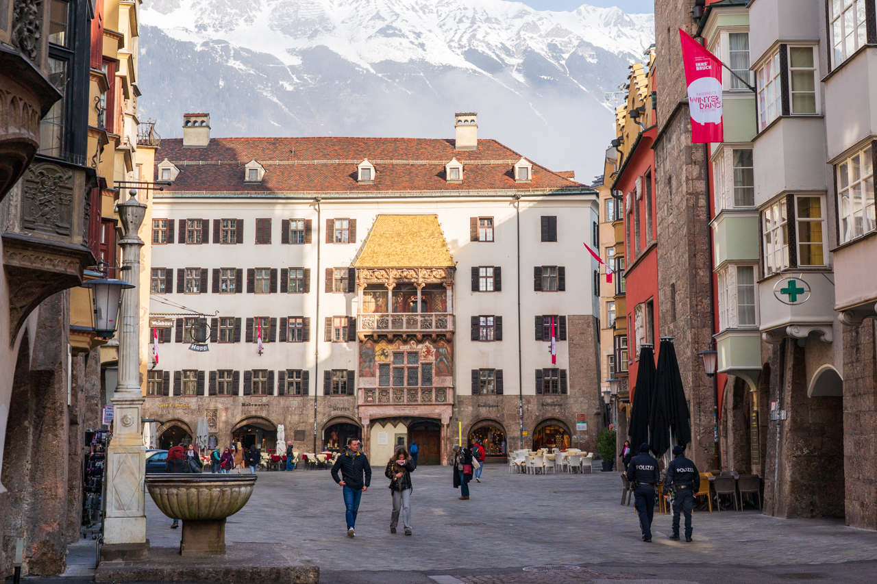 インスブルックで押さえておきたいスポットは、まず「黄金の小屋根」。旧市街の中心部にあり、神聖ローマ帝国のかつての皇帝マクシミリアン1世が、広場で行われる行事を見学するために造らせたものです。