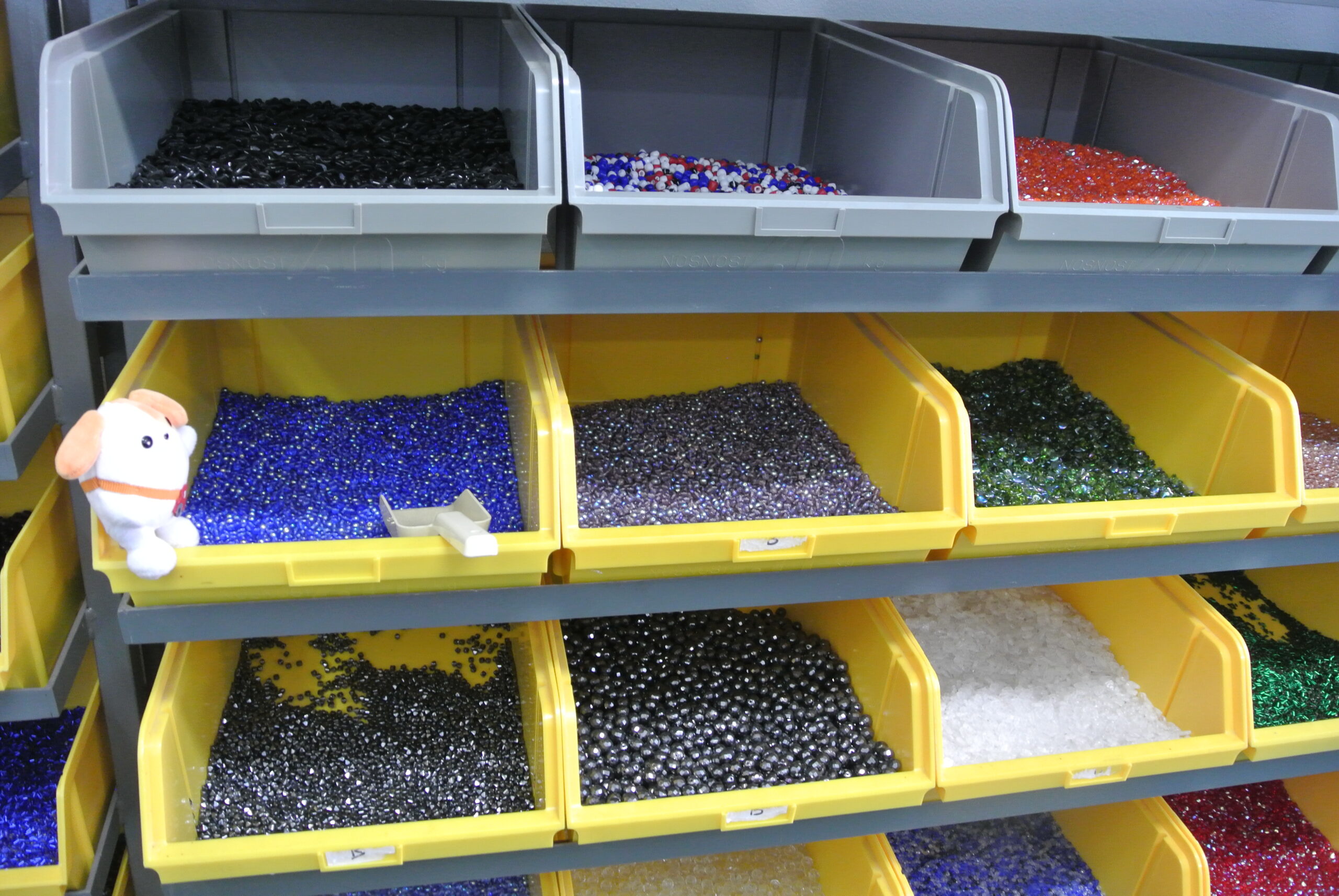 色の種類で棚が分けられていて、何百種類ものビーズが吊り下げられています。