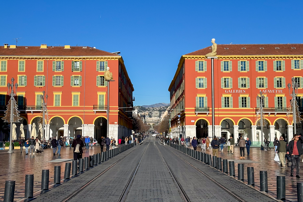 新市街はそのビーチの北側。新市街の中でも観光客が行動するエリアは、フランス国鉄(SNCF)ニース・ヴィル駅くらいまでだと思います。同地域はトラムが東西および南北を結ぶように走り、ジャン・メドサン通りを中心にデパートや大手チェーン店などニースの都市機能が集まっています。ビーチ沿いと異なり地元の人たちが使うお店も多いため、観光的な雰囲気は薄まりますが、飲食店などは値段と質が適正なお店が増える印象です。
