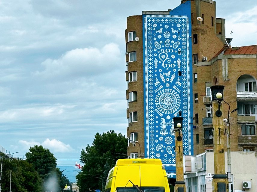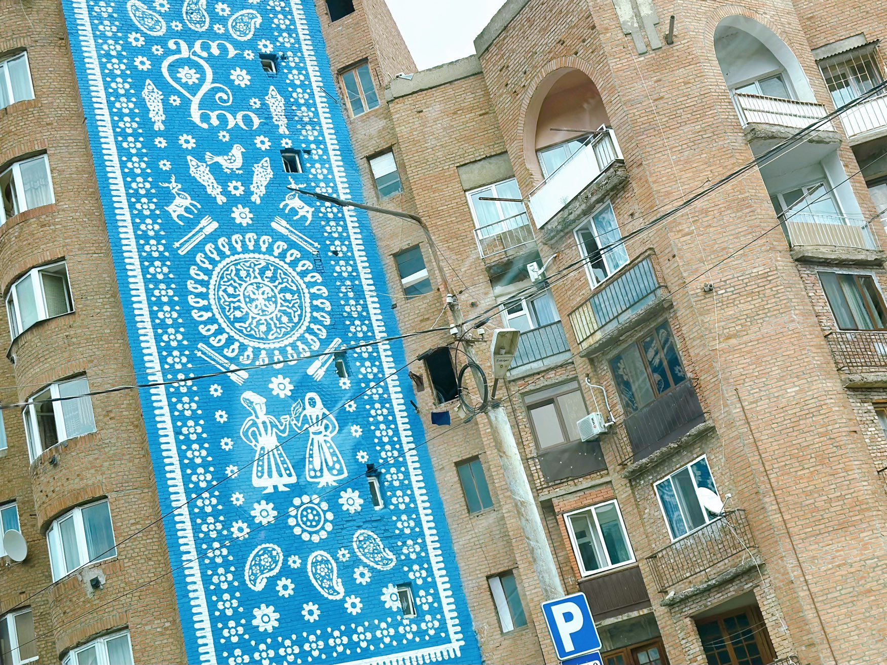 特に筆者が好きなのはクタイシで車中から発見した、Tina Chertova氏による”Georgian ornament”という作品です。これはジョージアの宴会であるSupraの際に机に敷かれるテーブルクロスの柄として有名な伝統的なデザインが、壁一面に描かれていました。
