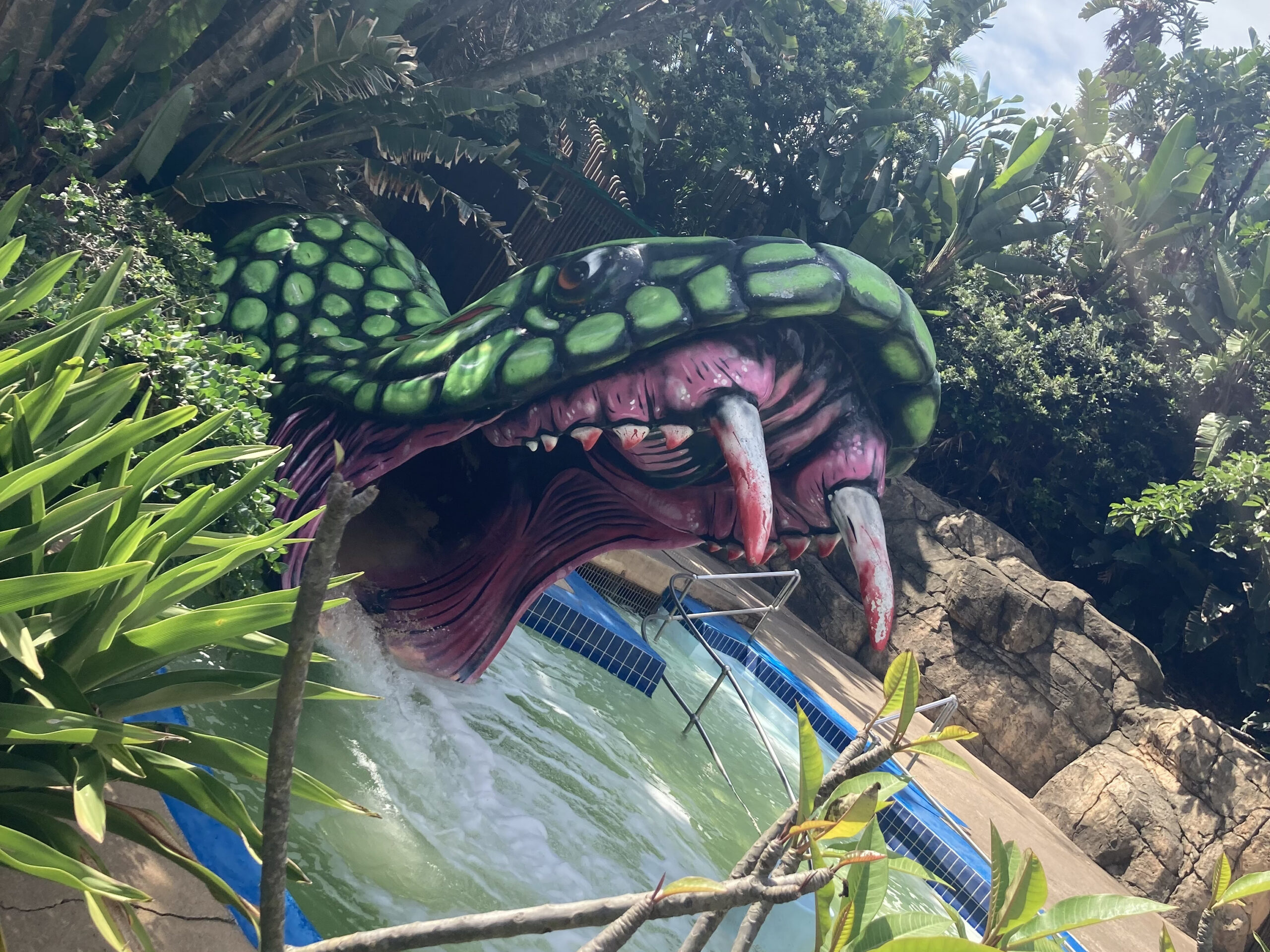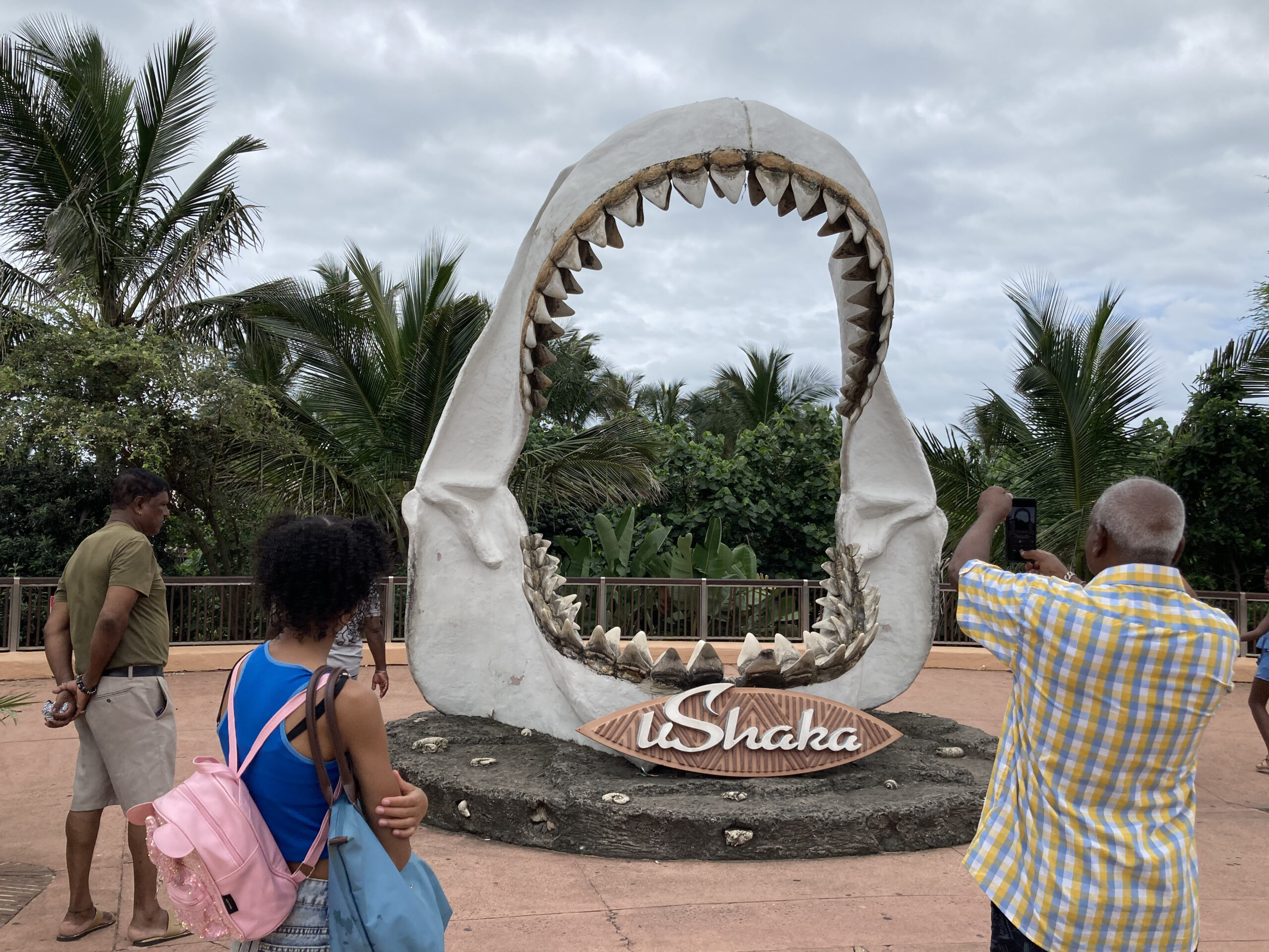 入り口のゲートから入るとまず巨大サメの歯のフォトスポットがお出迎え。ほとんどの人がここで写真を撮ってから園内に進んでいきます。