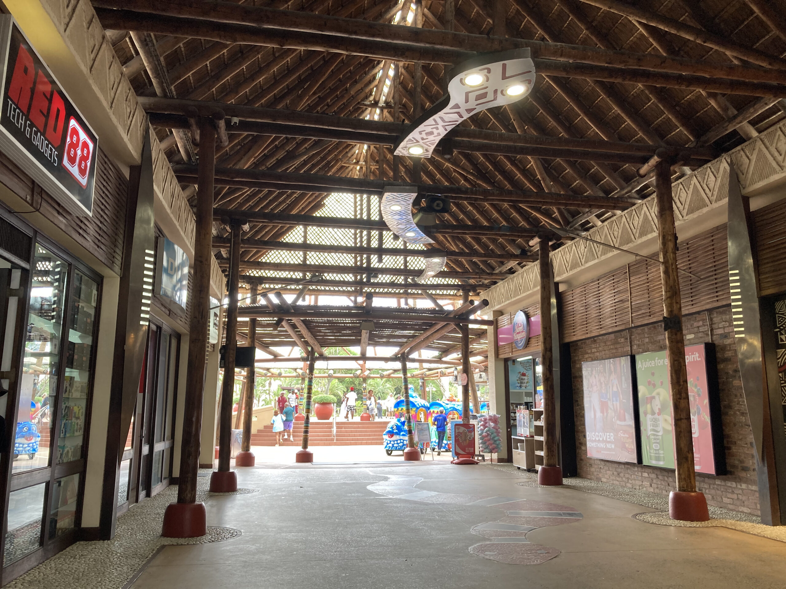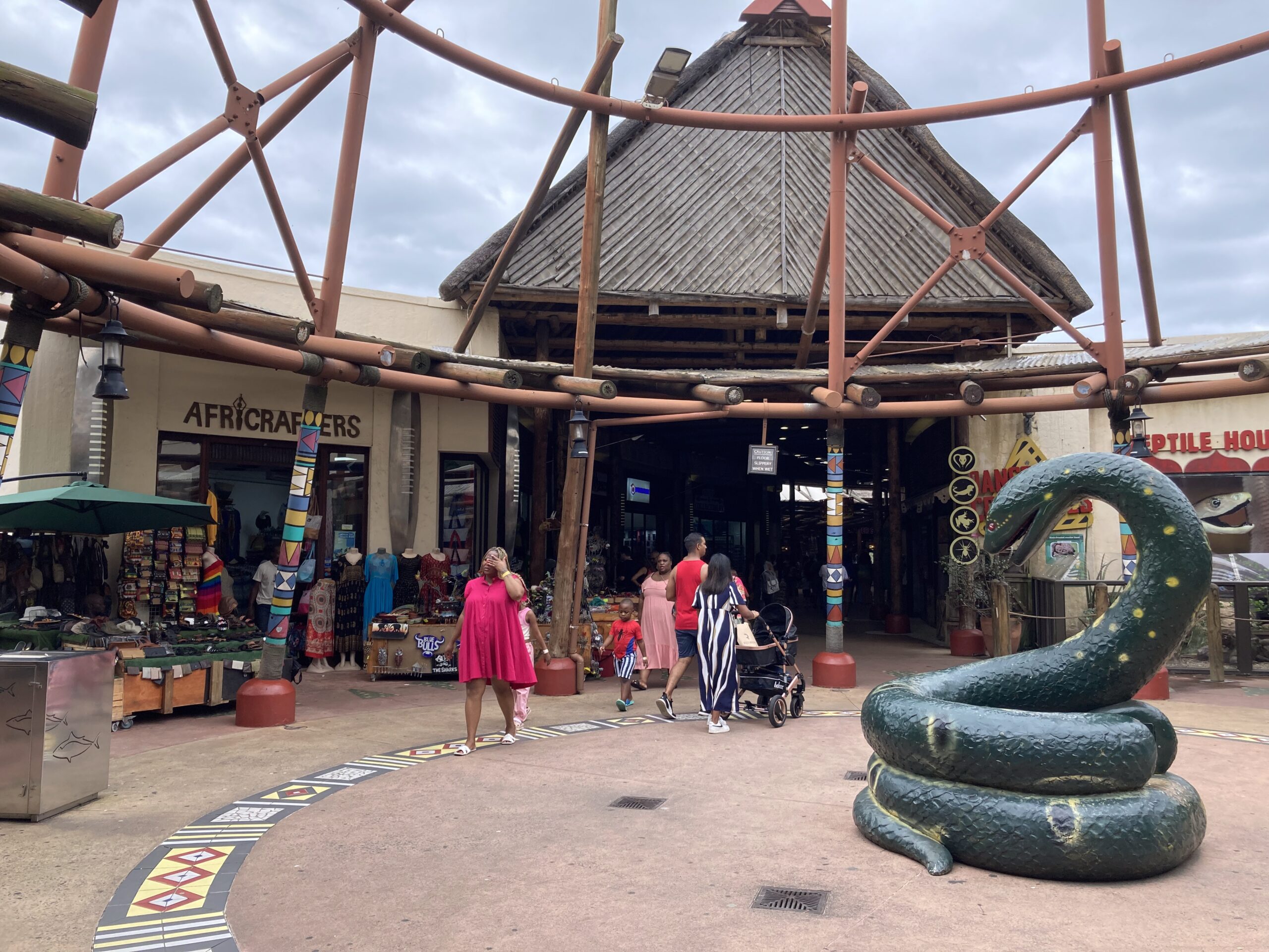 どの施設に行くにも、まずはヴィレッジウォークビーチモールというアーケードを通って進んでいきます。アフリカらしい魅力的なお土産やさんやレストランが軒を連ね、ついつい足が止まってしまいます。