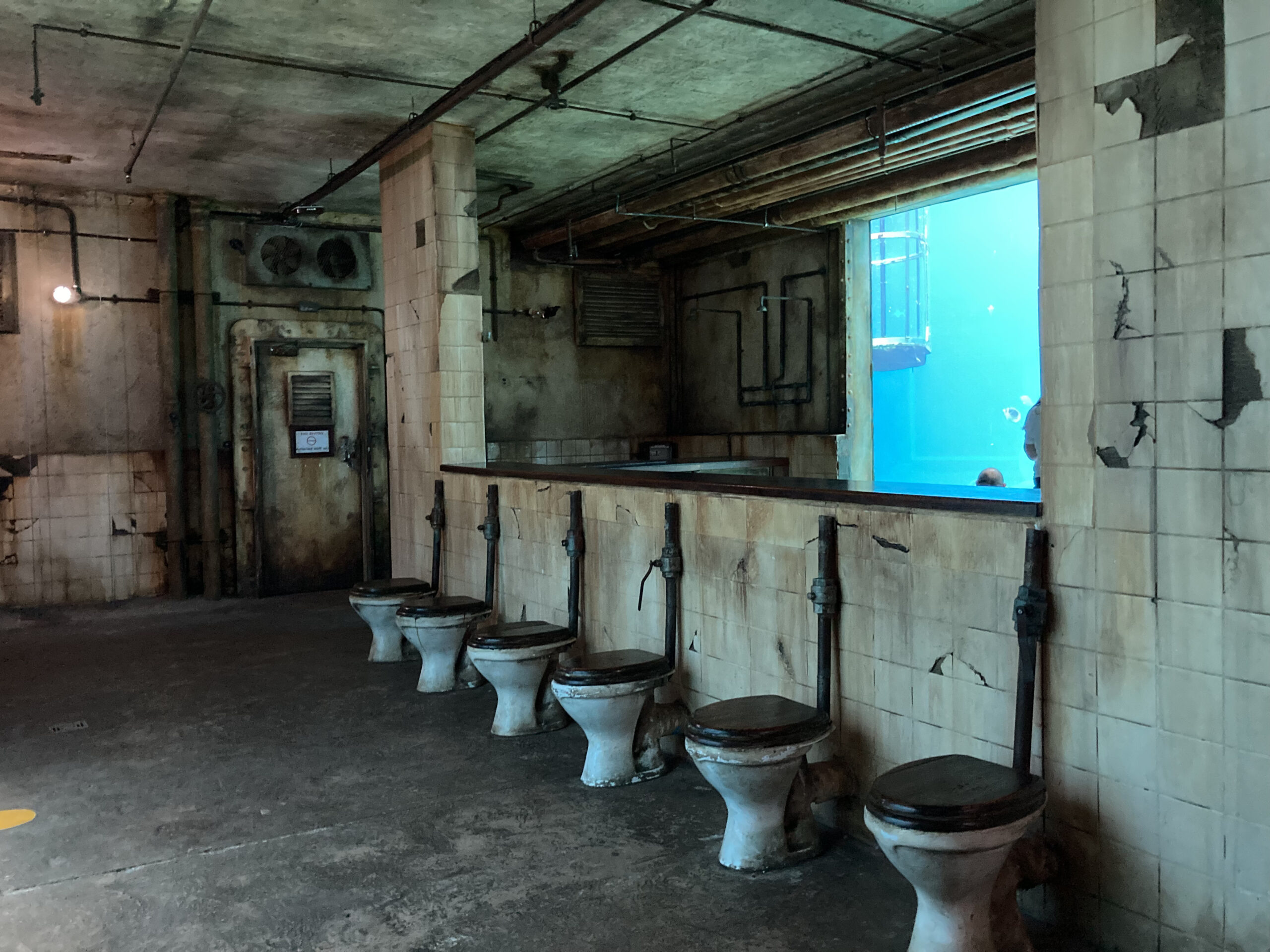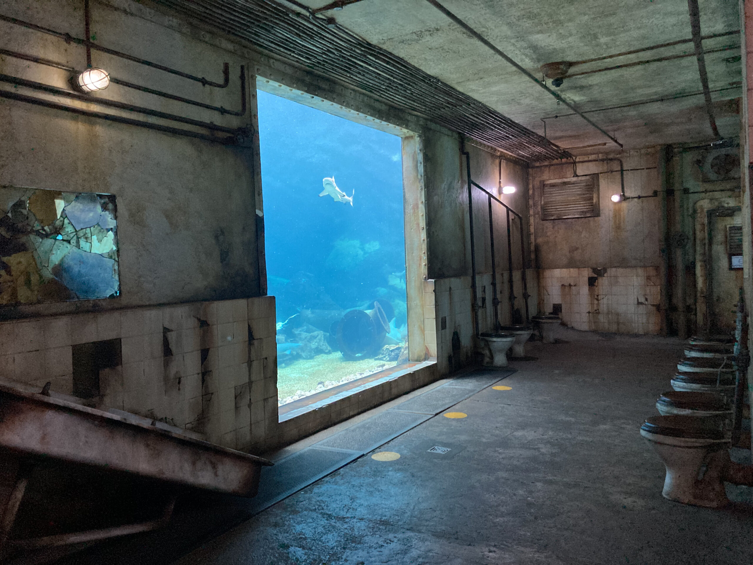 水族館は沈没船をイメージしており、かなり凝った作りになっています。私のお気に入りはトイレ風の展示スペース。かなりリアルです。