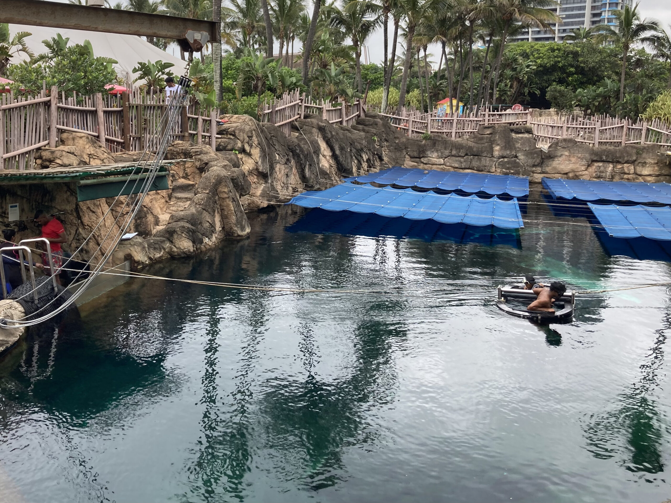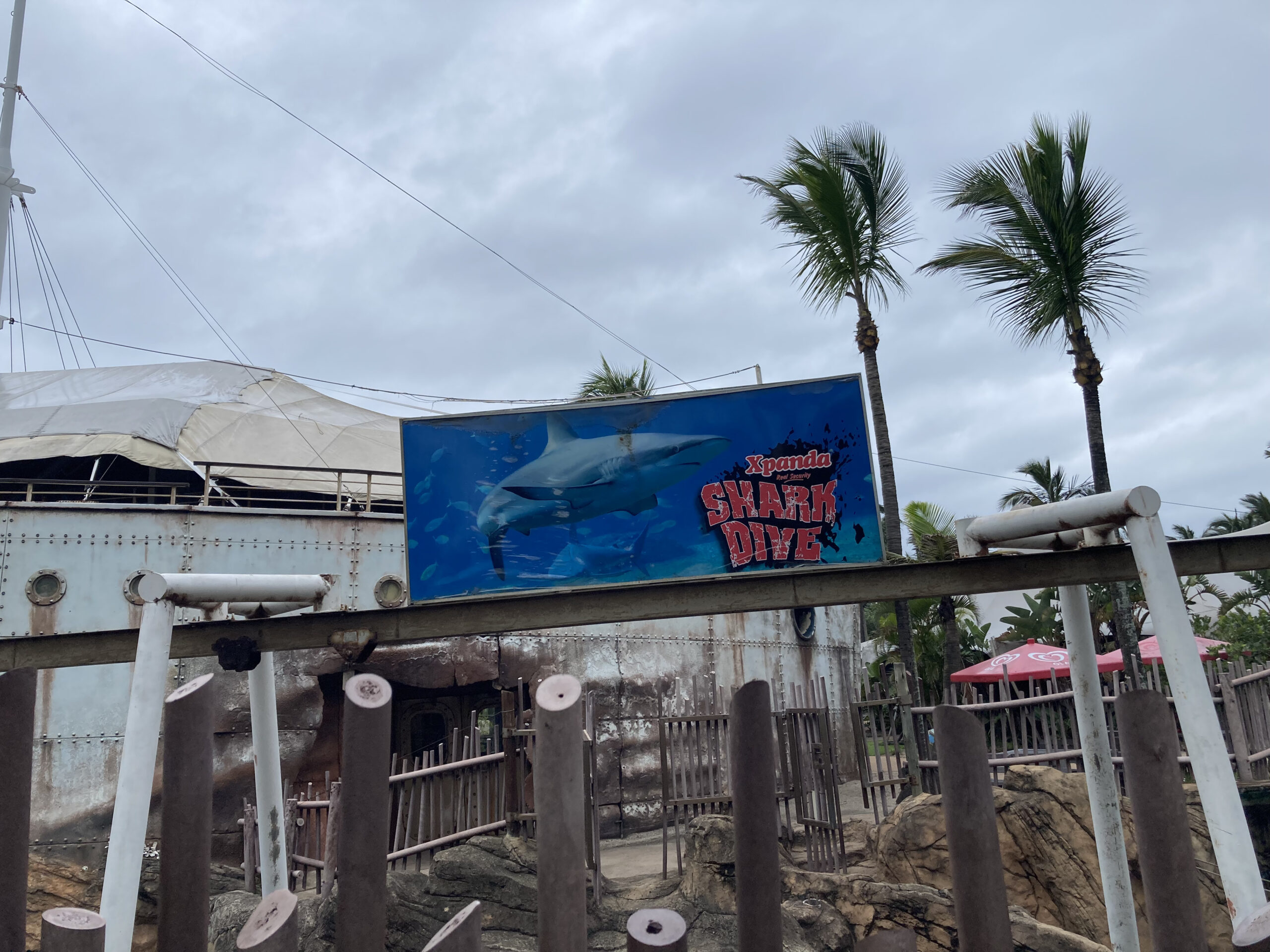 大きい浮き輪に乗って流れるプールをのんびり進んでいくコースもあり、ところどころで隣接する水族館のサメの水槽が見られるようになっています。