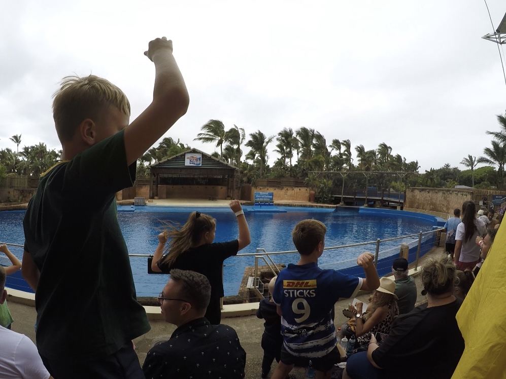 どちらのショーも、始まる前にショーに参加できるボランティアを複数名募集するのですが、選ばれる基準は「最もノリノリに踊った人」です。まず会場にクラブミュージックが流れ、みんなその場で立ち上がり思い思いのダンスを披露します。そこで最もノリノリだった人がボランティアに選ばれます。まだイルカが一頭も出てきていないとは思えないほどかなり盛り上がります。