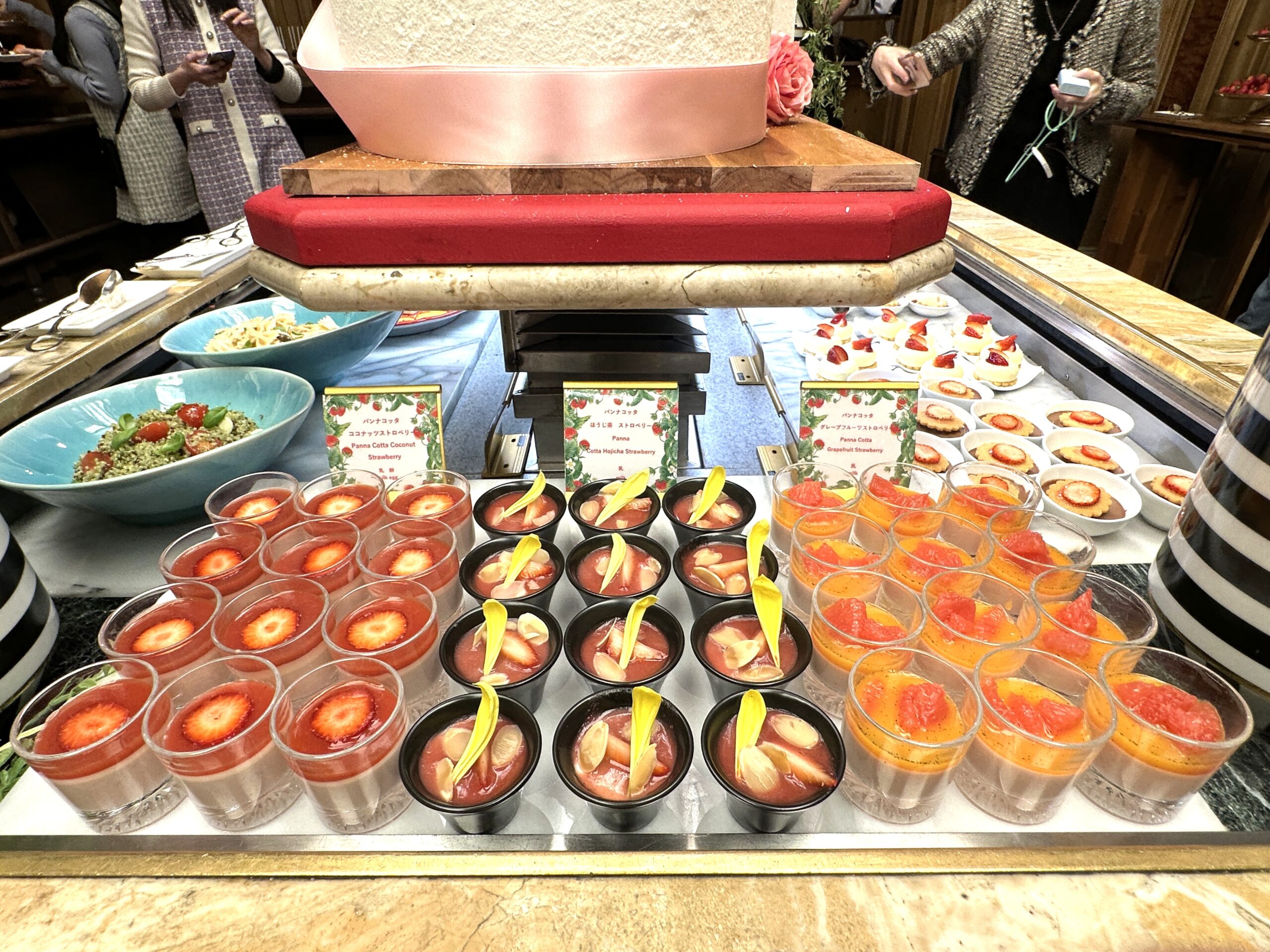 エグゼクティブペストリーシェフ ・フレデリック・モロー氏(画像右下)による苺を使った20種類のスイーツが登場!ライブデザートは「ストロベリー大福」。求肥に包まれたスポンジとフレッシュ苺、生クリーム、苺ゼリーが絶妙に絡み、口の中でとろけるような食感が楽しめます。