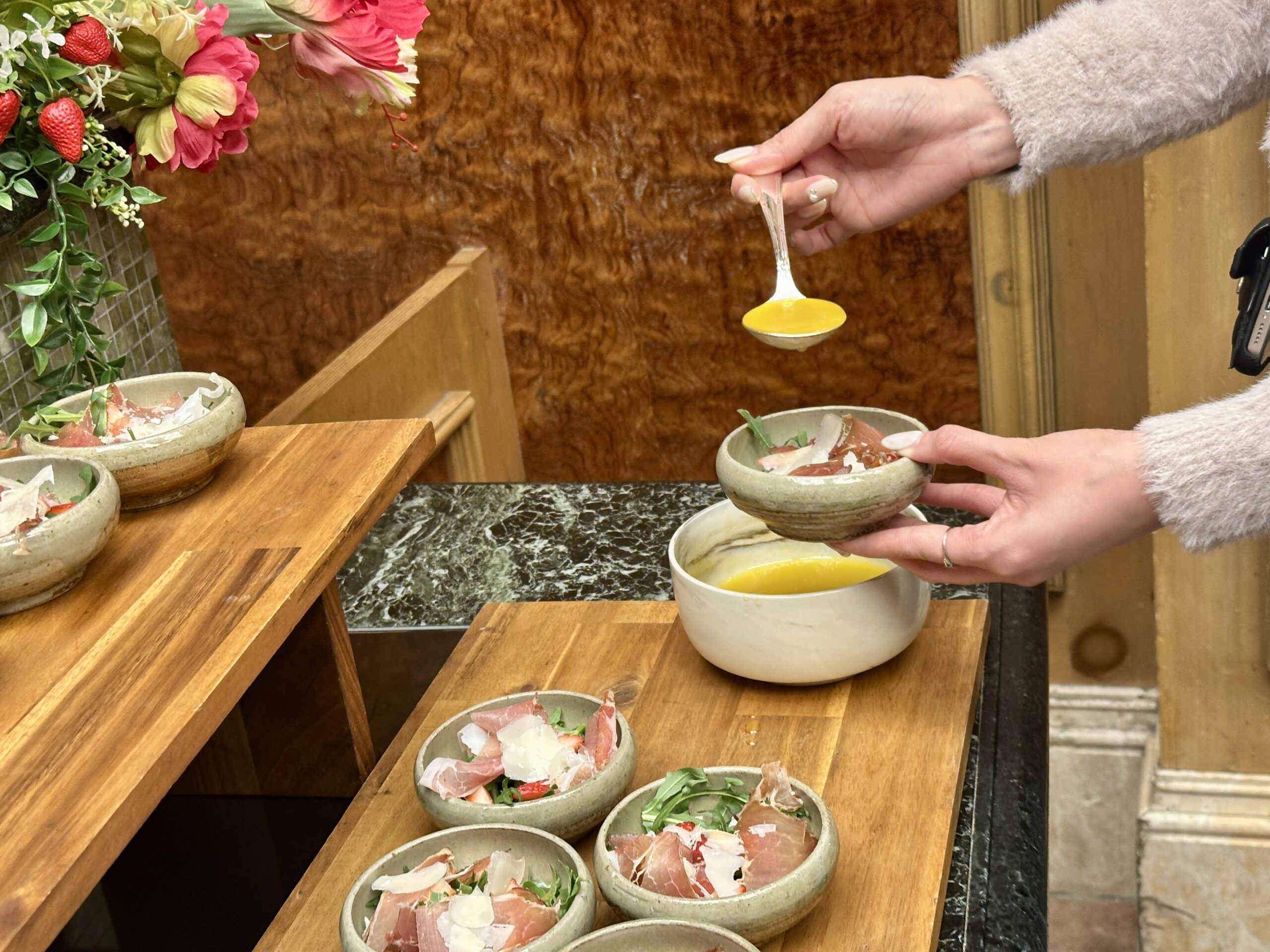 苺の酸味とイタリアンの豊かな風味が絶妙に絡み合い、五感を満たす贅沢な味わいが楽しめます。筆者が好きなのは「苺サラダ」や「キヌアカプレーゼサラダ」。生ハムやフレッシュな野菜と、オリーブオイルや自家製ドレッシングが相性抜群です。
