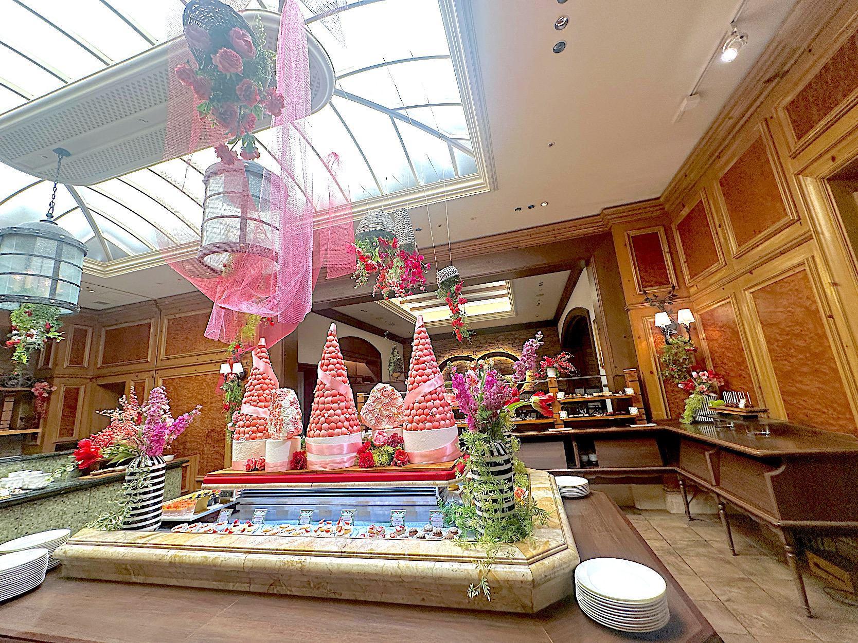 会場の装飾は、春のガーデンをイメージした華やかなもの。淡いサーモンピンクのマカロンや美しいお花、チュールが会場を包み込み、食事を楽しむ前から視覚的にも楽しませてくれます。