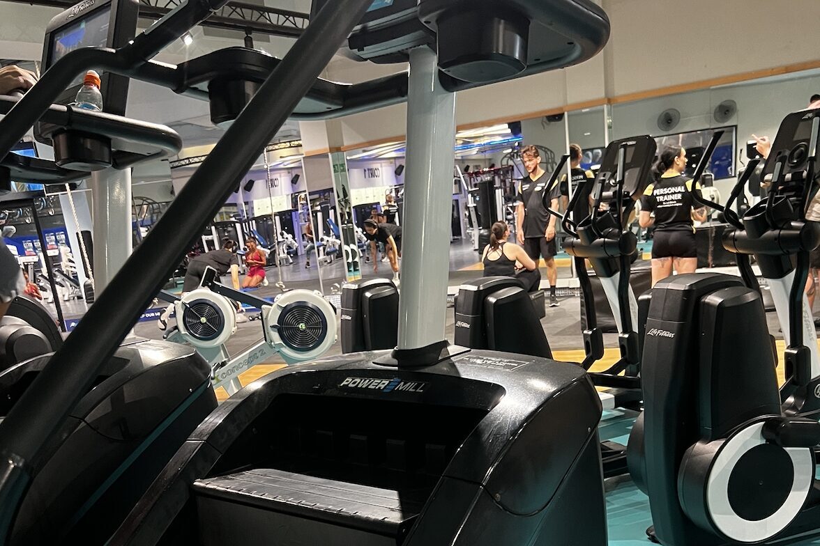 Cynergi最大の特徴は、充実したトレーニング設備です。一般的な筋トレ・有酸素運動マシンに加え、日本ではあまり見かけないトレーニング機材も多数揃っています。私のお気に入りは背中や脚の裏側を鍛えられる「Tバーロウマシン」と、膝への負担が少なく高いカロリー消費が期待できる「クライムミル」。どちらも日本のジムではあまり見たことがないものですが、非常にオススメです。