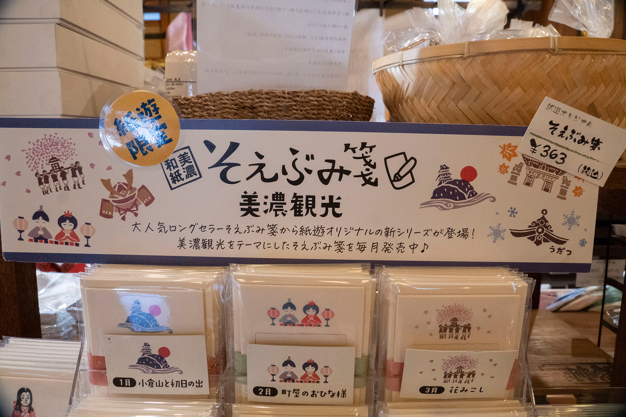 築70年の紙倉庫を店舗と使用しているという和紙のお店「紙遊」。運営する古川紙工は「文房具屋さん大賞」で毎年上位入賞を果たし、ヒット商品を出し続けている老舗文具メーカーです。美濃和紙以外にも日本各地の和紙や、多種多様な紙雑貨、小物が店内ところ狭しと並びます。美濃観光をテーマにした紙遊限定の「そえぶみ箋」は手頃な価格でかわいくて、美濃のお土産におすすめ!(私も買いました。)