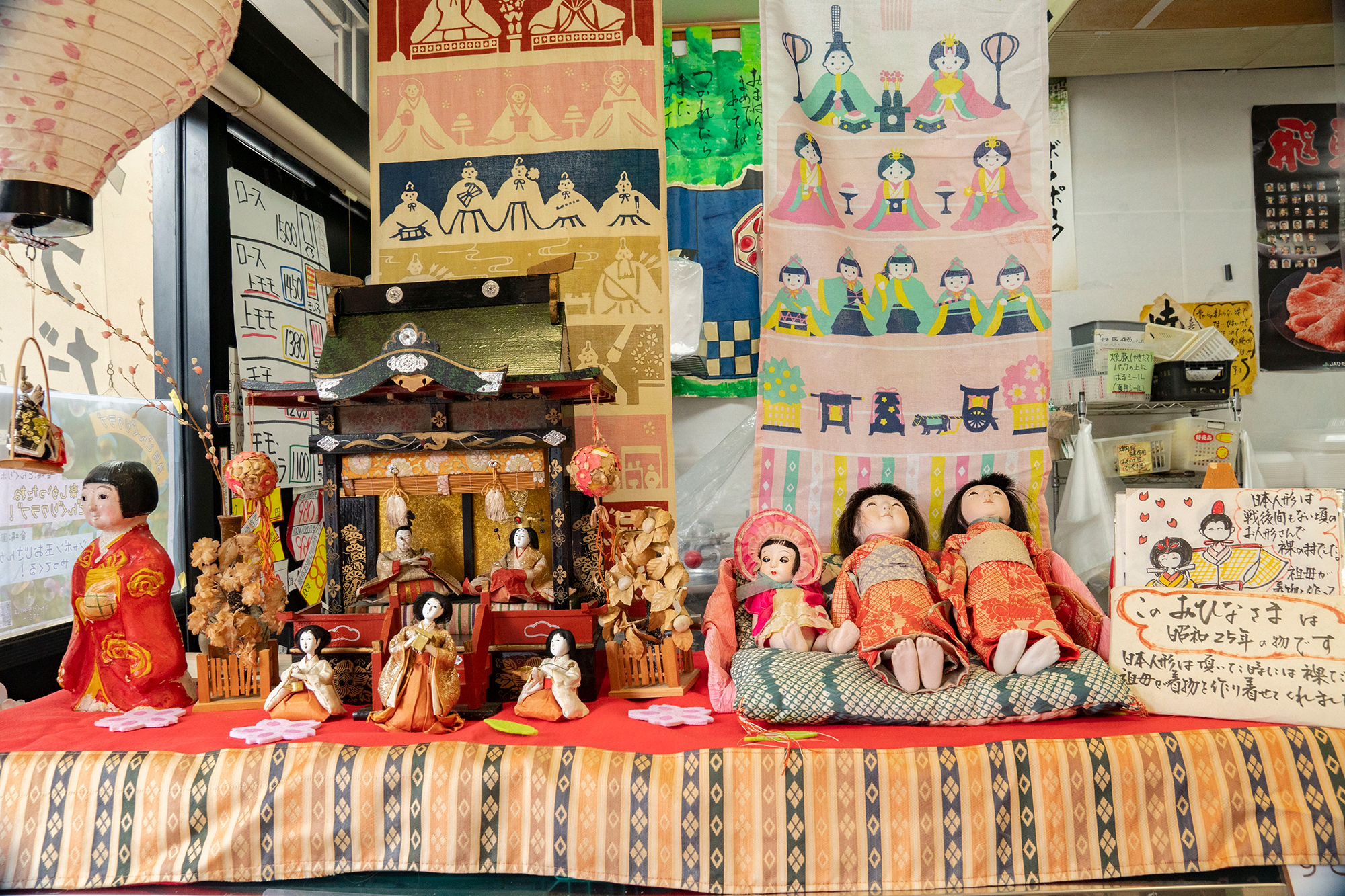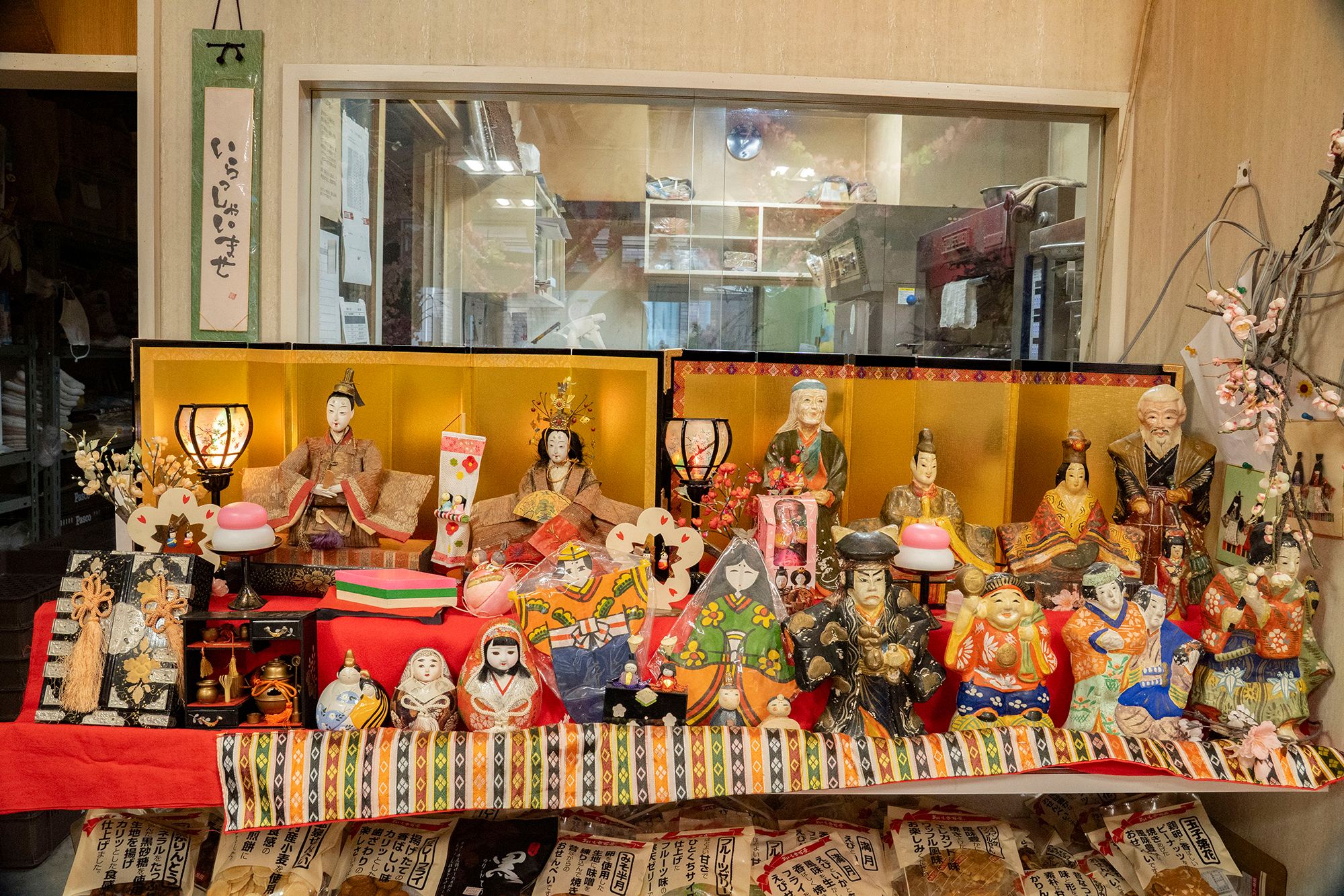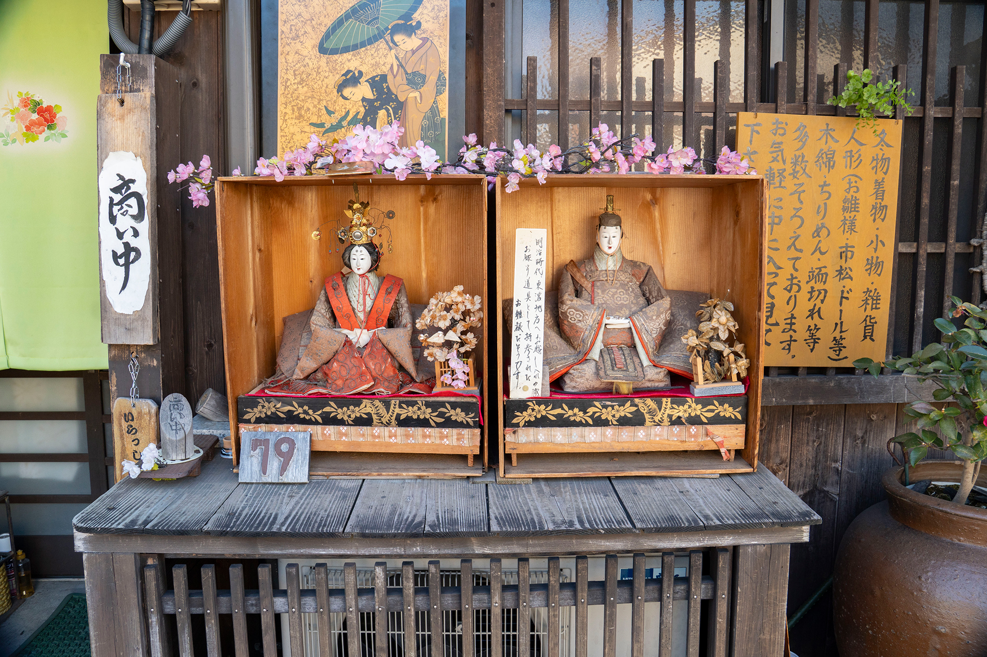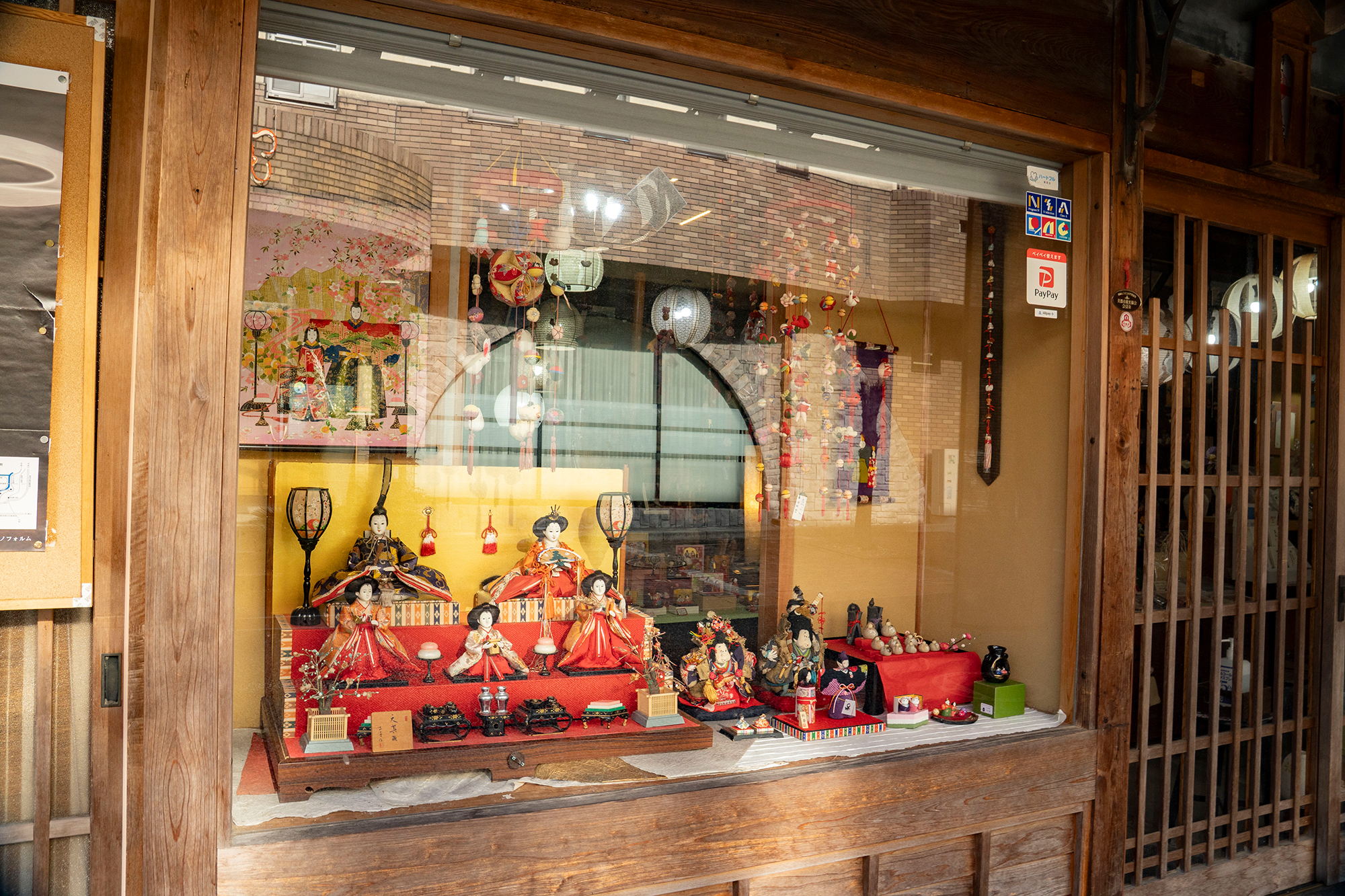 参加店・施設の軒先や、店内に飾られたおひなさまは、明治、大正、昭和など様々な時代から受け継がれてきたものや、和紙が使われたものなど多種多様。うだつの上がる町並みには何度も訪れていますが、いつもは入ったことのないお店にも、「おひなさまを見せてください」と入っていきやすいのが嬉しい。