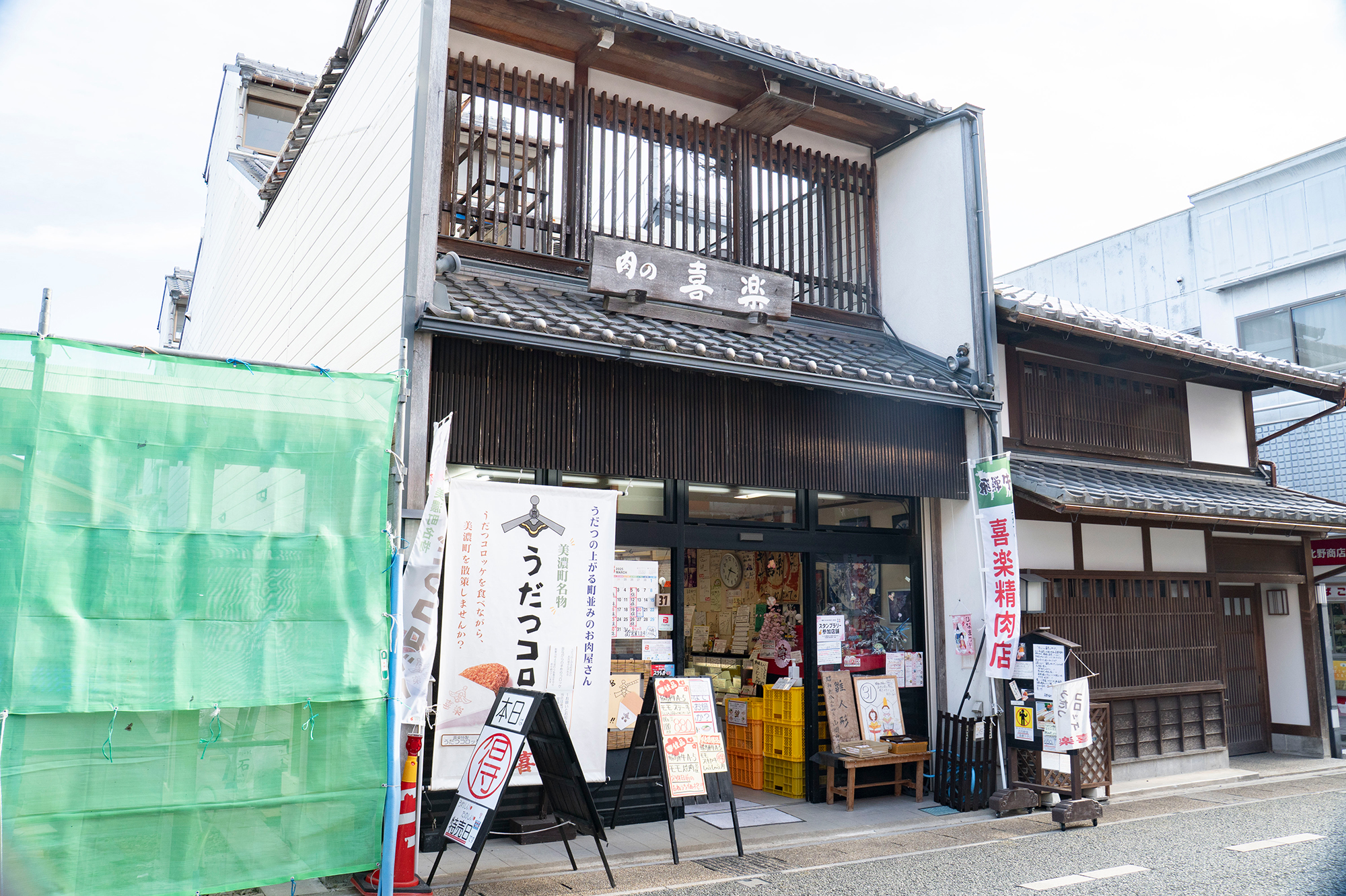 町並みの中にある昔ながらの精肉店。コロッケなどを食べ歩き用にしてくれます。うずらやハムカツ、ミンチカツなどもありますが、この日は豚肉チーズ巻きをチョイス。売り切れていたのかケースにはなかったけれど、わざわざ揚げてくれました。店頭に飾られている、ガンダムの雛飾りは必見です!