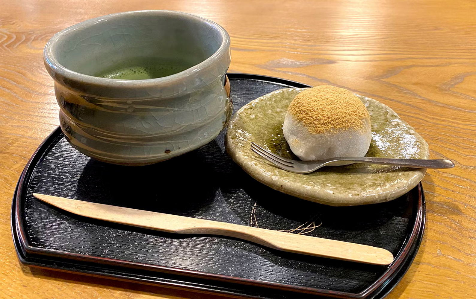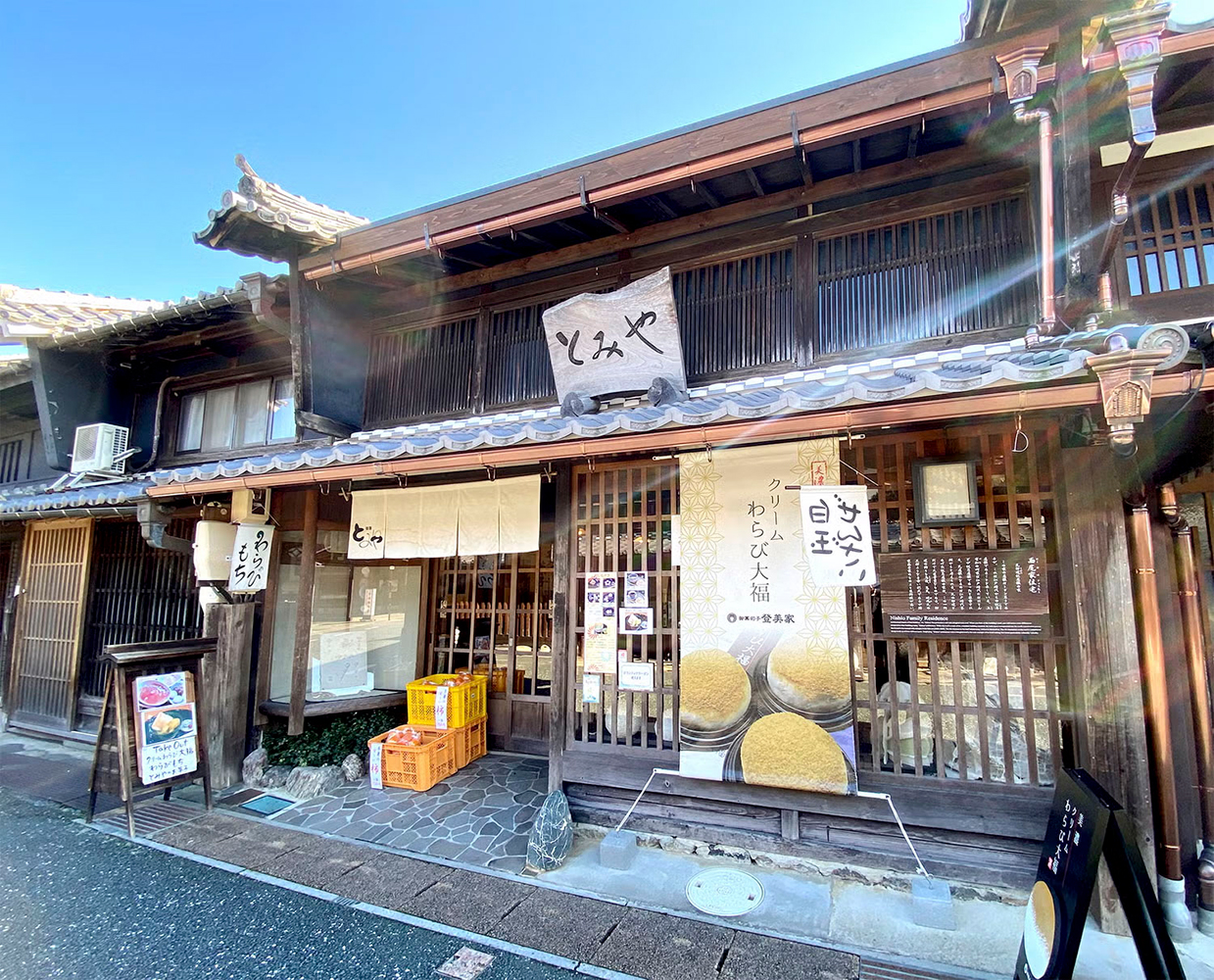 江戸末期の建物を利用した「古民家カフェ 茶房とみや」。栗ぜんざいやクリーム白玉あんみつ等々のメニューにも心惹かれますが、登美家オリジナルの大福「クリームわらび大福」とお抹茶のセット。クリームわらび大福は、わらび餅と粒あんと生クリームをふんわりしたお餅で包みこみ、きな粉をかけた大福です。イートインはもちろん、お土産として購入することもできます。