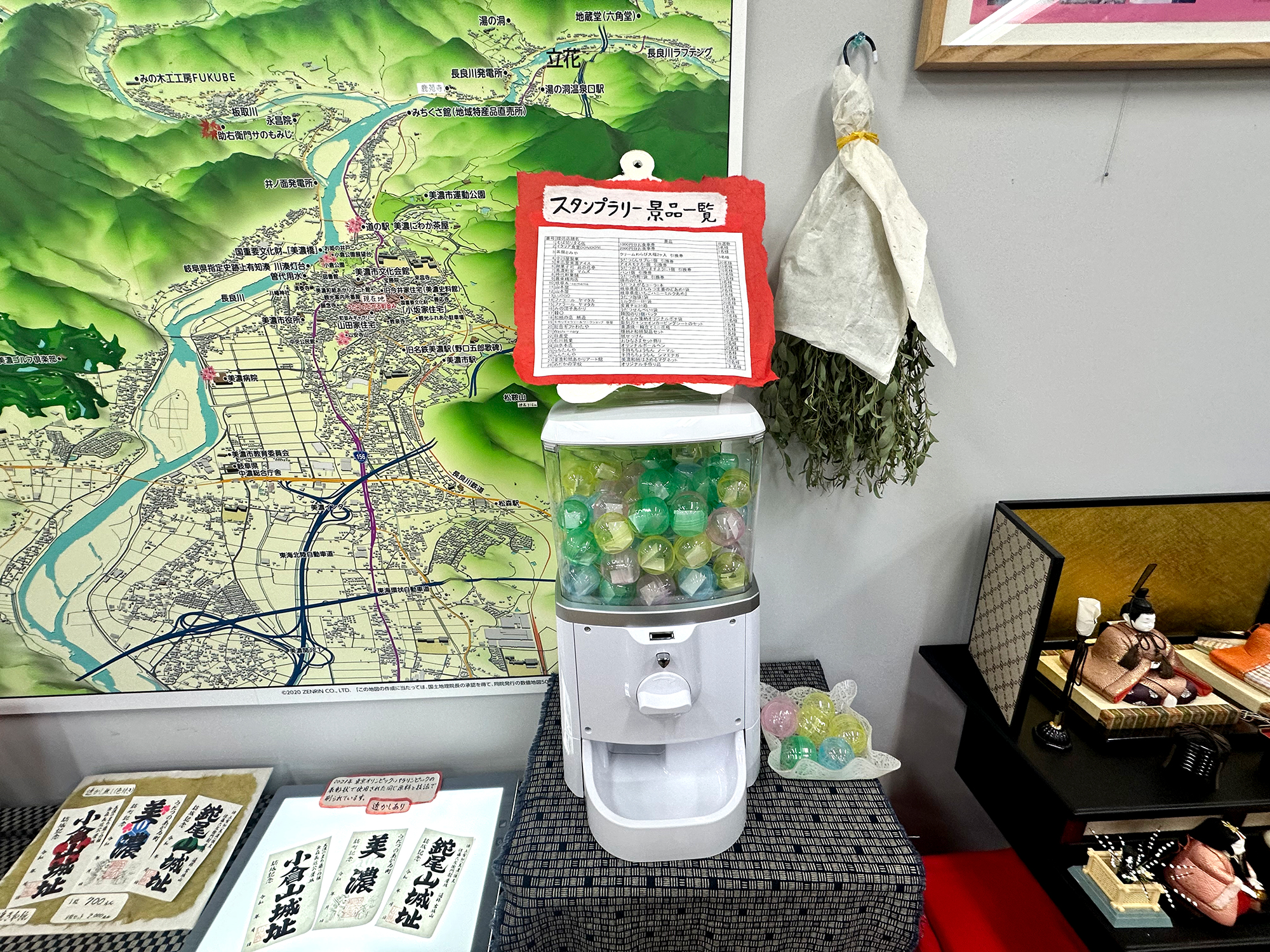 あちこち立ち寄りながら散策するので、スタンプ4つはあっという間に集まります。観光案内所の「番屋」へ戻り、5つめのスタンプを押して、抽選はガチャガチャで。景品は、町並みの各店舗からの提供で、お食事券やお菓子の引換券、和紙製品などなど様々です。私が引き当てたのは上記でご紹介した「和紙の店 紙遊」さんの「そえぶみ箋柄オリジナルポチ袋」でした。