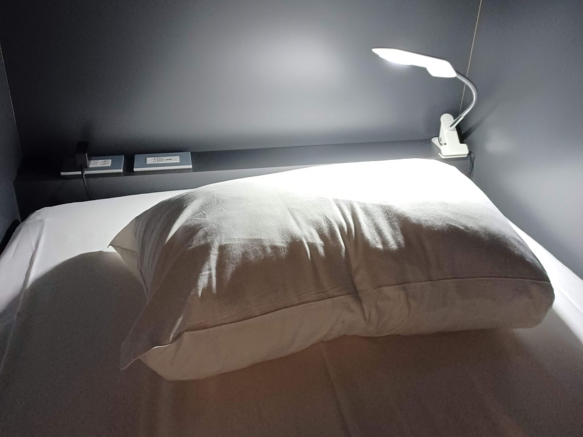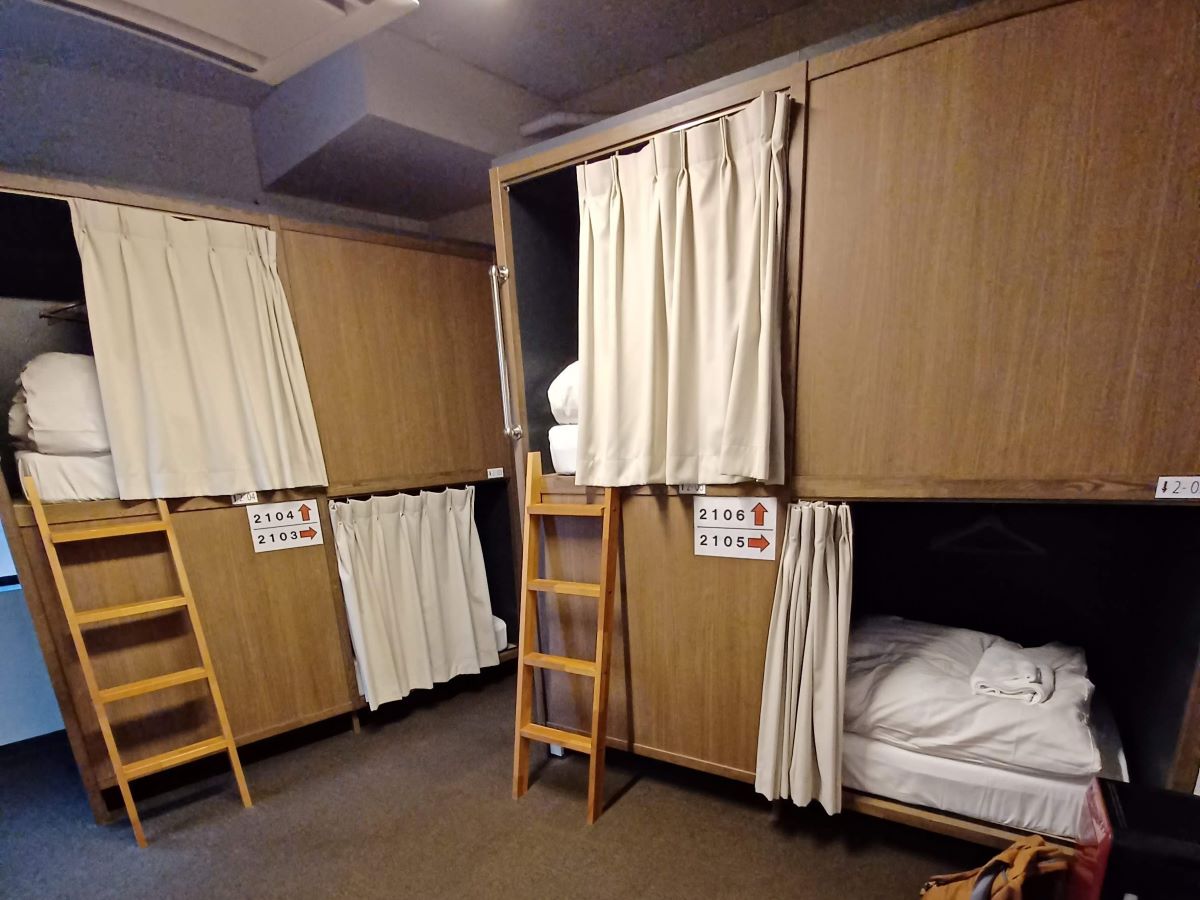 各部屋のベッドは箱型の二段ベッドになっており、それぞれのベッドには読書灯とコンセント、洋服ハンガーがついています。シャワー、トイレは共用になりますが、男女別に利用できるようになっています。ベッドに入るとカーテン以外は板壁に囲まれているので、あまり周囲の目を気にせずに過ごせます。