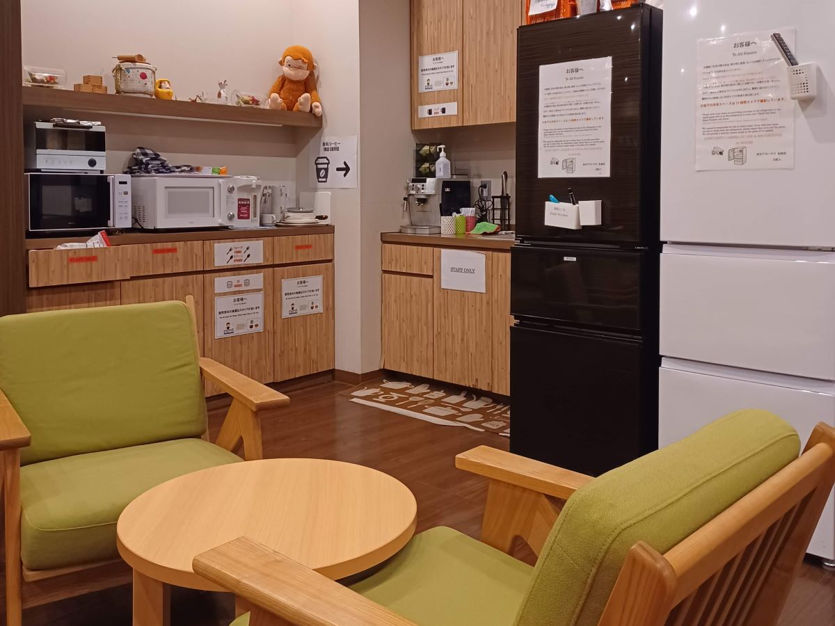 屋上スペースにはフリースペースの屋上ベランダとコイン式の洗濯機・乾燥機が2台ずつあります。地下には宿泊者がいつでも利用できるラウンジがあり、無料でセルフサービスのコーヒーやお茶を飲みながら棚にあるマンガや本を読んでくつろいだり、オンラインで仕事をしている方もいらっしゃいます。宿泊室では飲食が不可なので、地下のラウンジで食事をします。宿泊者用に冷蔵庫と電子レンジも自由に利用できます。