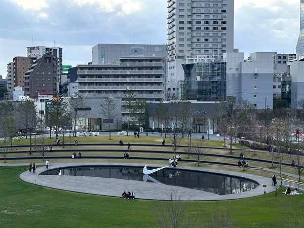 1階にはうめきた公園と直結する広場があり、テイクアウトしたスイーツやドリンクを持って、芝生広場でピクニック気分を楽しめます。スターバックスやヨーキーズクレープリーなど、テイクアウト可能な店舗も多く、青空の下で食事を楽しむことができます。