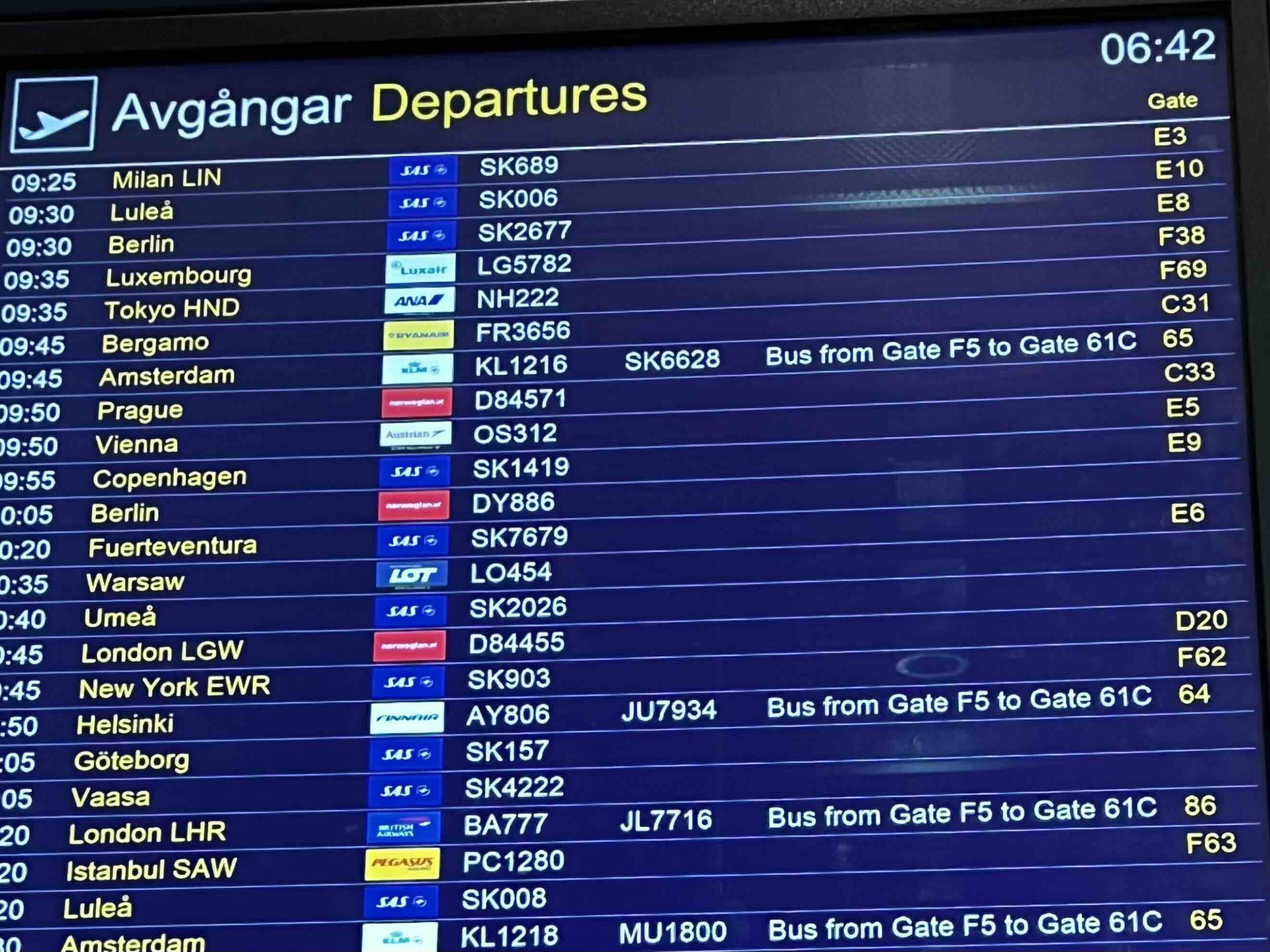 上記でも述べたとおり、シェンゲン域外への出国はFエリアとなるため、ラウンジを含めて他のフライト発着エリアから離れた場所となります(Fエリアには一部シェンゲン域内発着フライトもあり)。ANAウェブサイトでアーランダ空港内マップが公開されているので、乗り継ぎを含めて、空港内移動に不安を感じる方はあらかじめチェックしておくことをお勧めします。